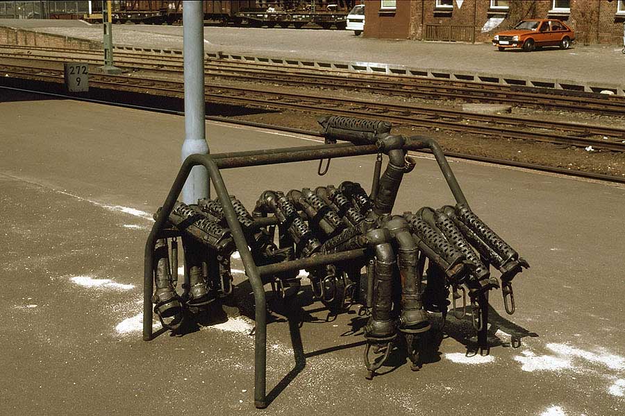 km 272,9 in Cuxhaven - 1982 alltäglich: Ein Heizschlauch-Halter auf dem Bahnsteig für die Dampfheizung im Zug.