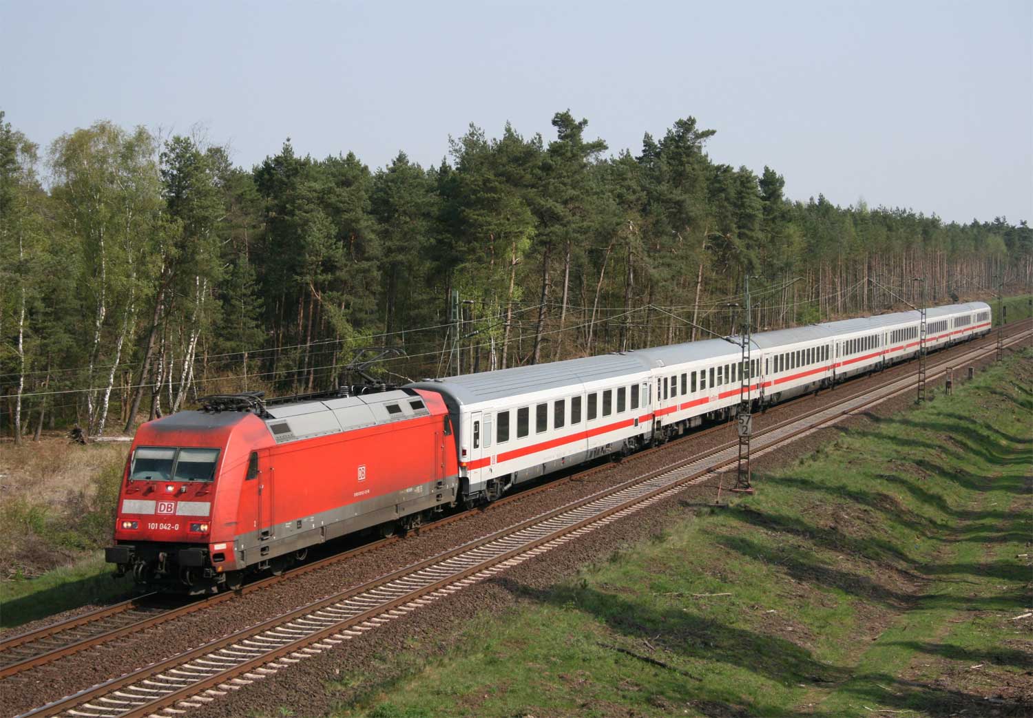 km 57,2 (Tafel) und km 57,3 (Stein, rechts im Hintergrund) zwischen Garßen und Eschede - 101 042 mit IC 2371