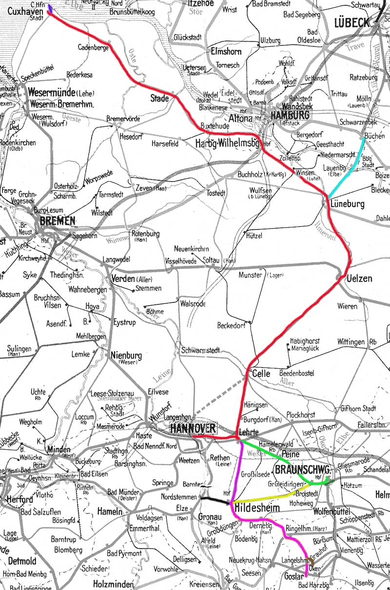 Hannover Hbf - Lehrte - Celle - Lüneburg - Hamburg-Harburg - Cuxhaven Stadt mit Abzweig nach Cuxhaven Hafen (Amerikahafen)