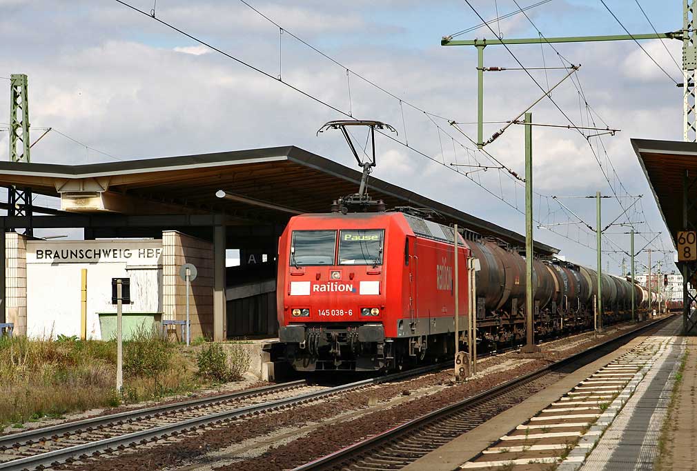 in Braunschweig Hbf 145 038 mit einem Kesselwagenzug Foto: Pascal, 08.09.2012