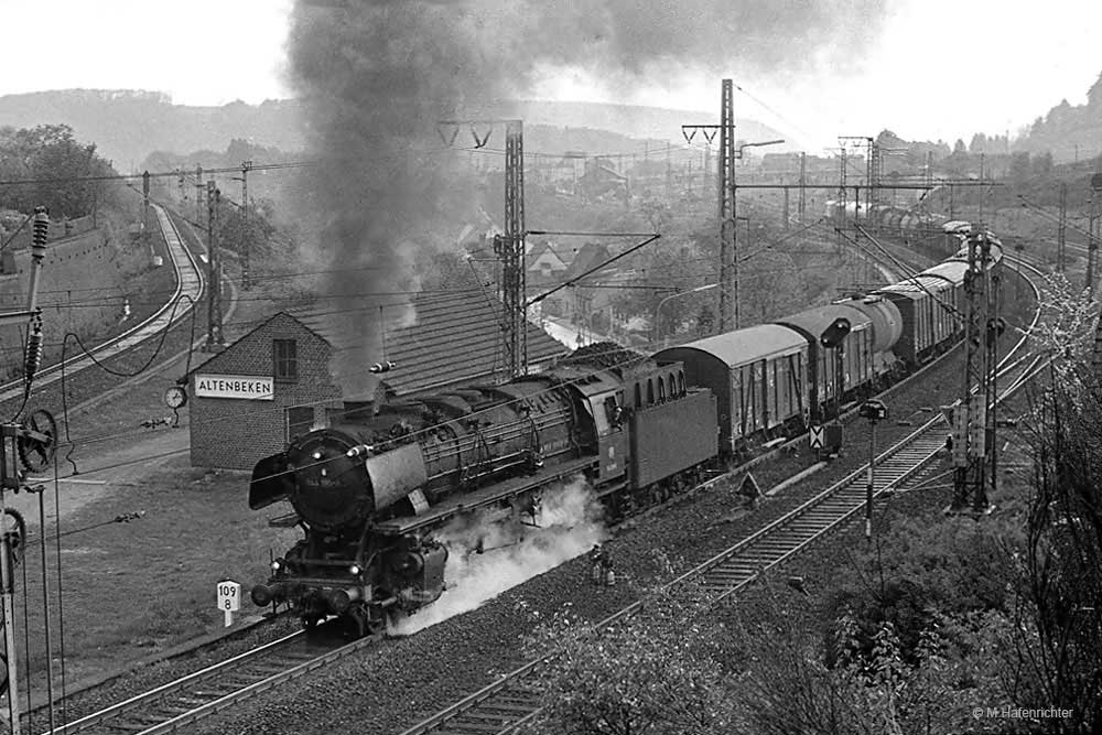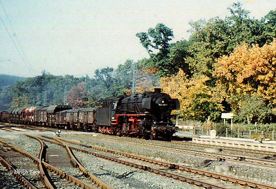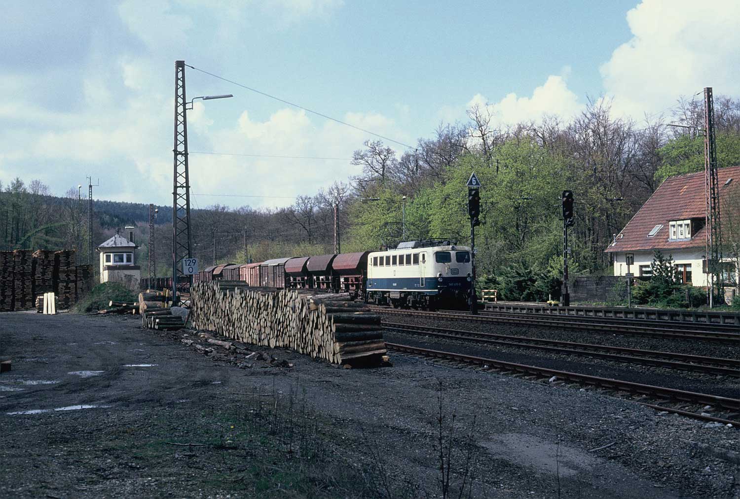 km 129,0 - Den Bahnhof Willebadessen durchfährt diese 043 mit einem schönen gemischten Güterzug und rollt nun nach Kassel hinunter.