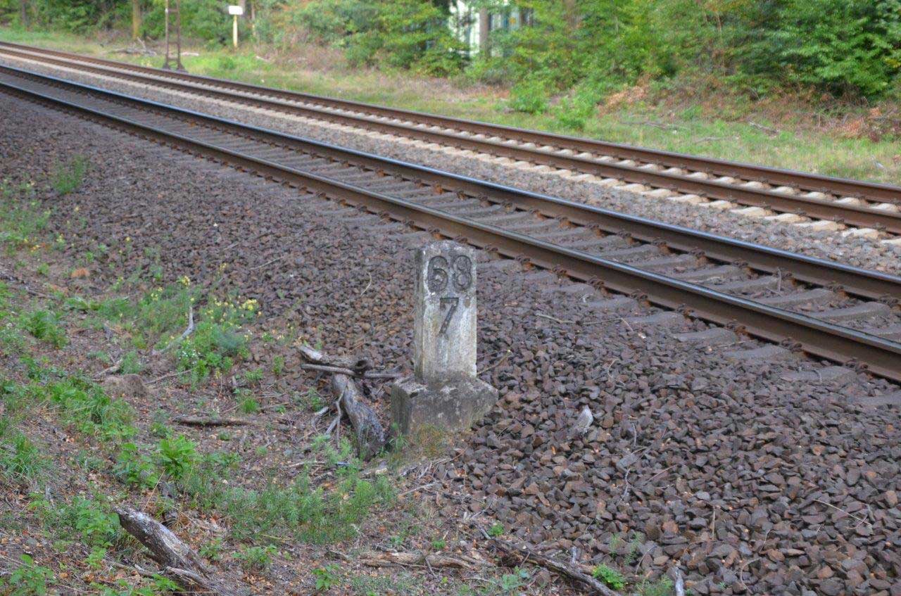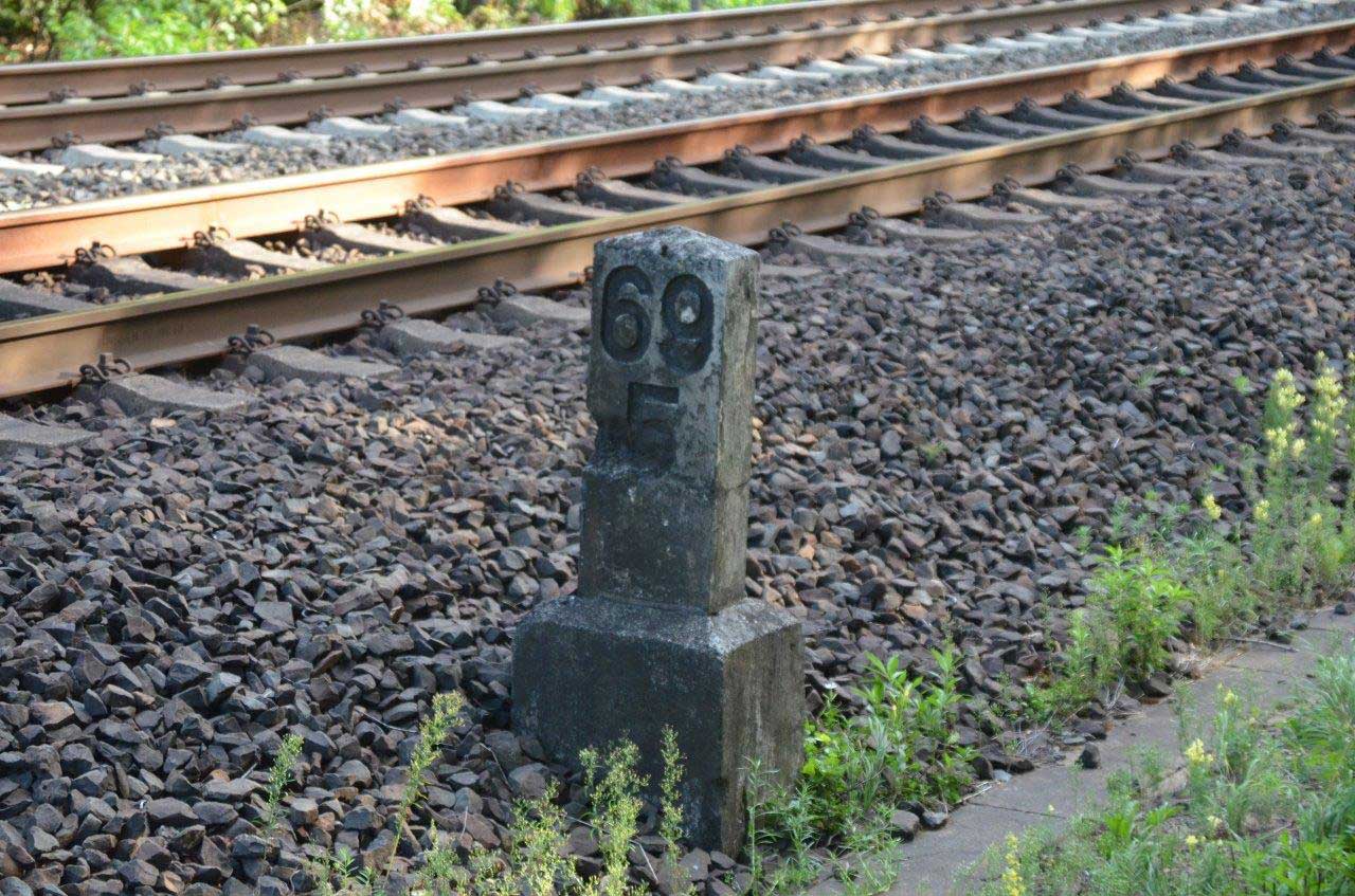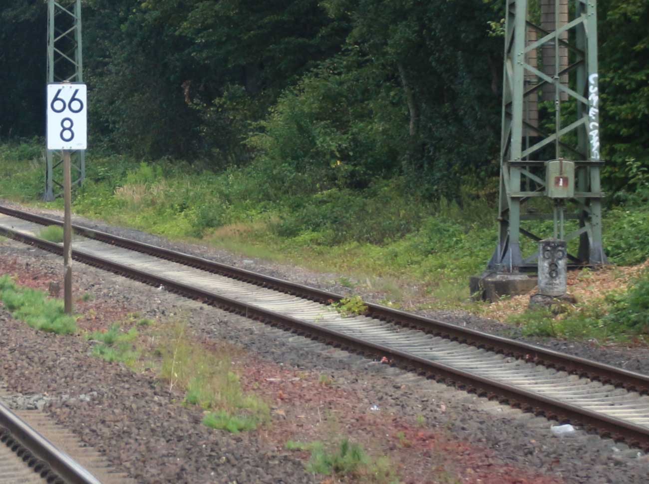 km 20,0 (verschmutzte Tafel in Bildmitte) gehört zum Streckenast der Strecke