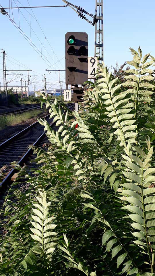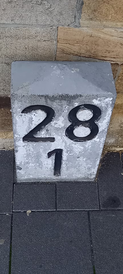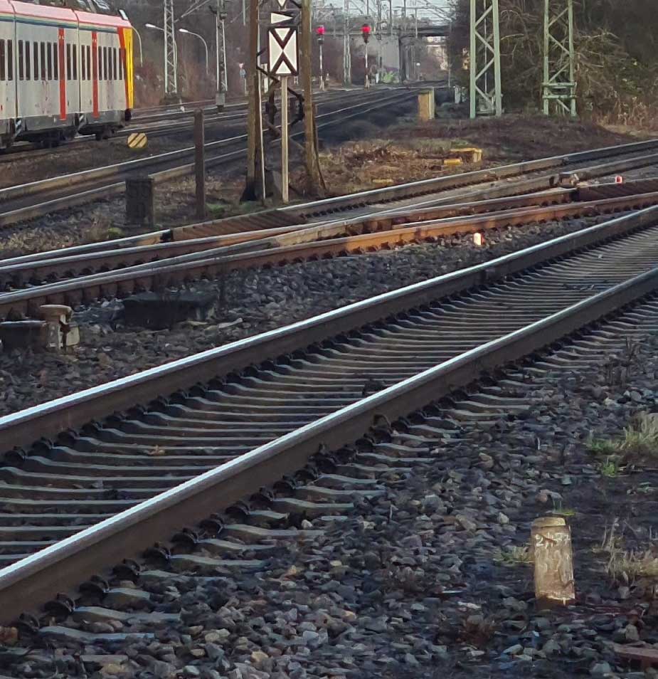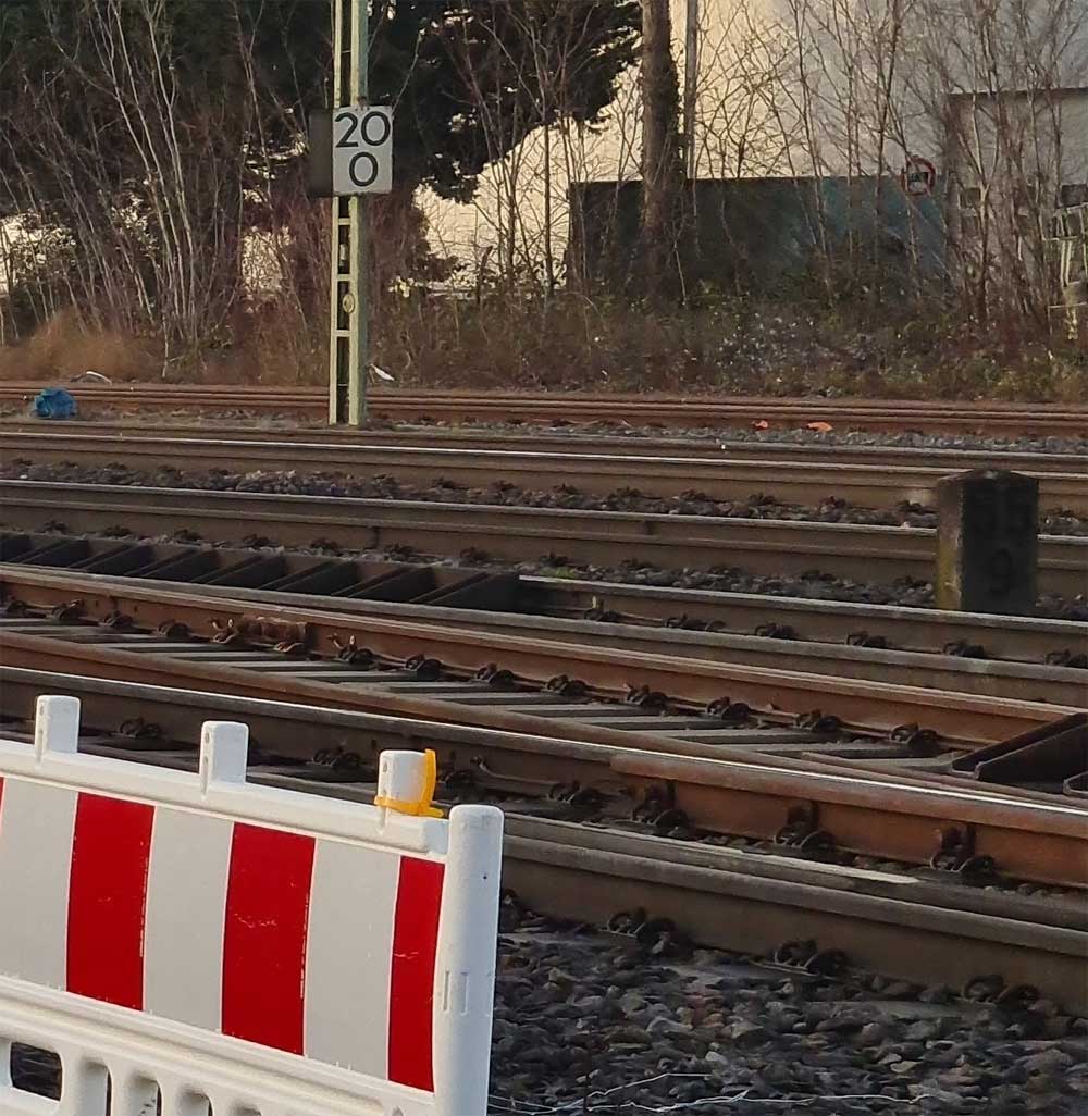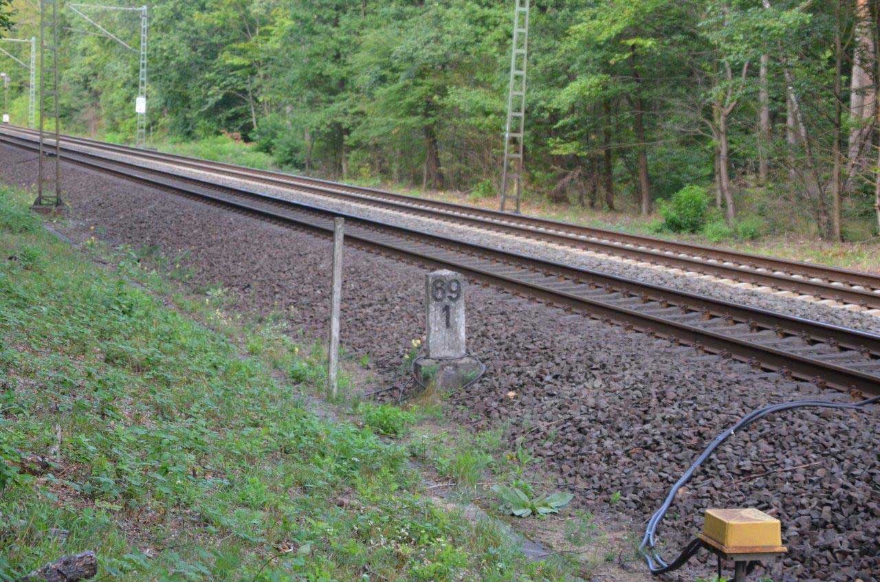 km 20,0 (verschmutzte Tafel in Bildmitte) gehört zum Streckenast der Strecke