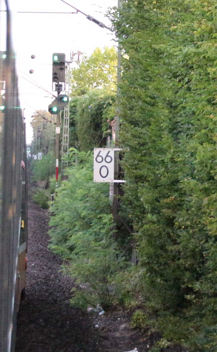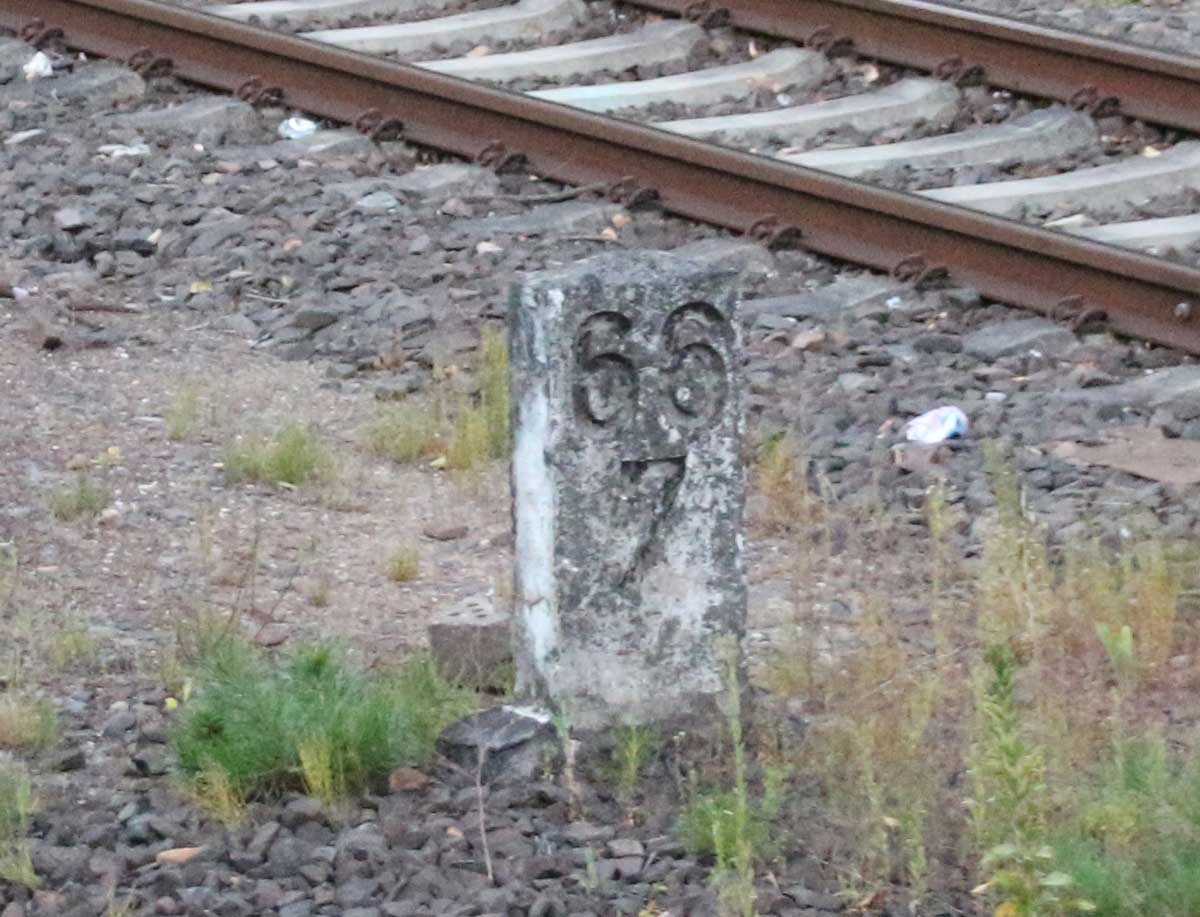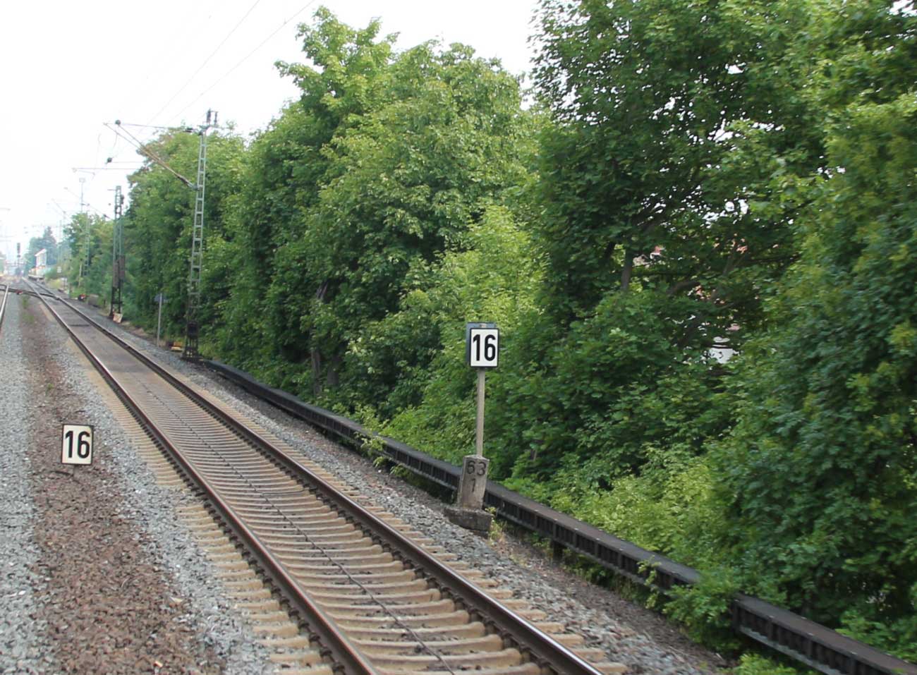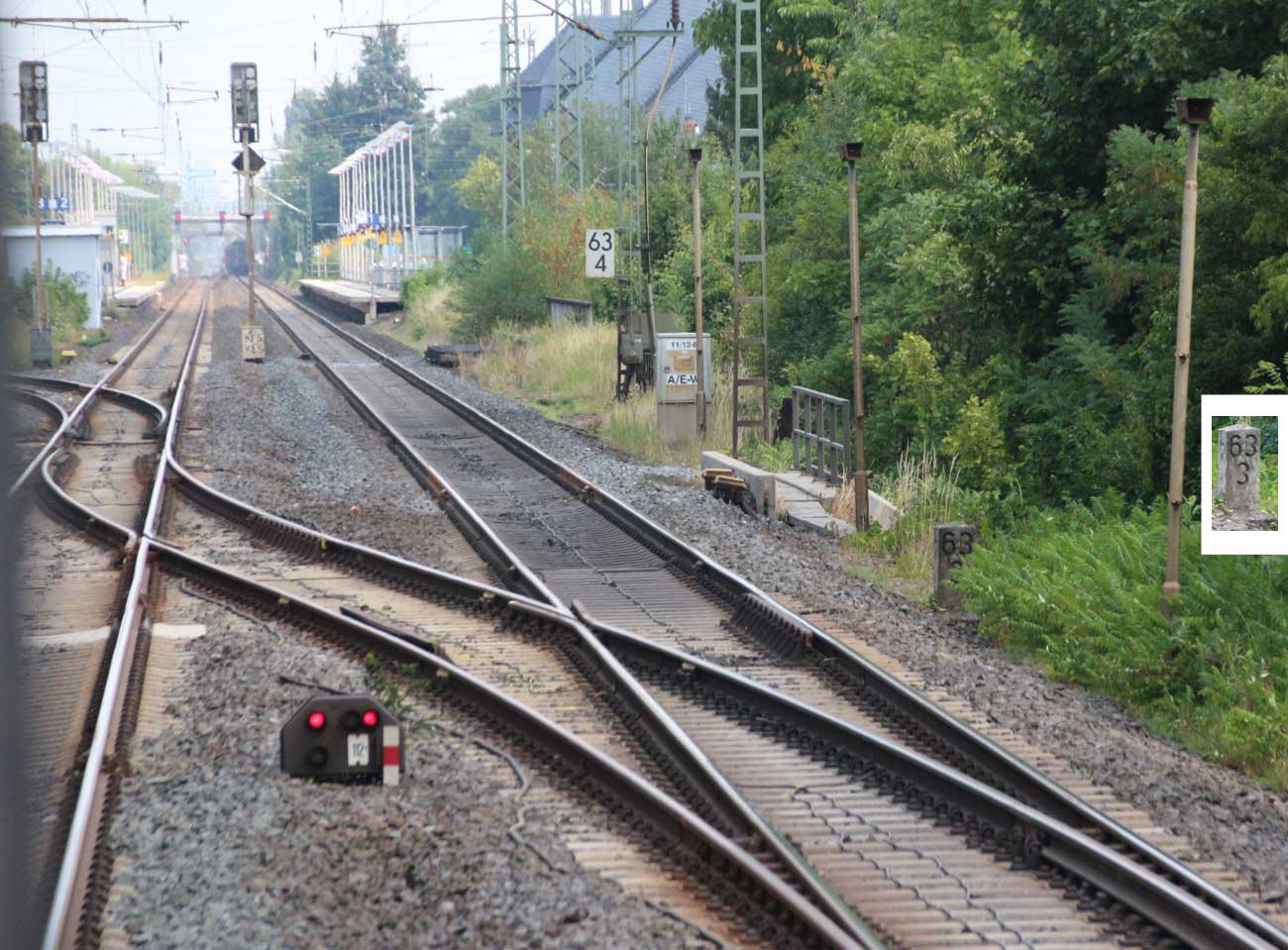 km 55,3 (Hintergrund) gehört zur Strecke nach Frankfurt (Main) Stadion [früher: Frankfurt (Main)-Sportfeld]