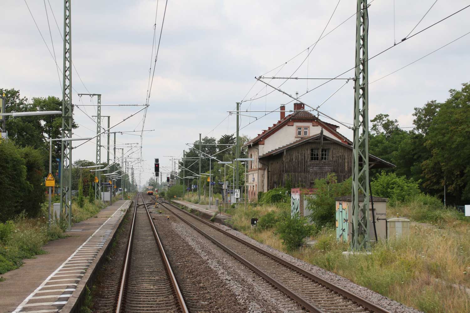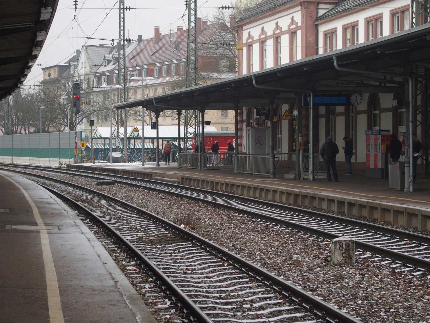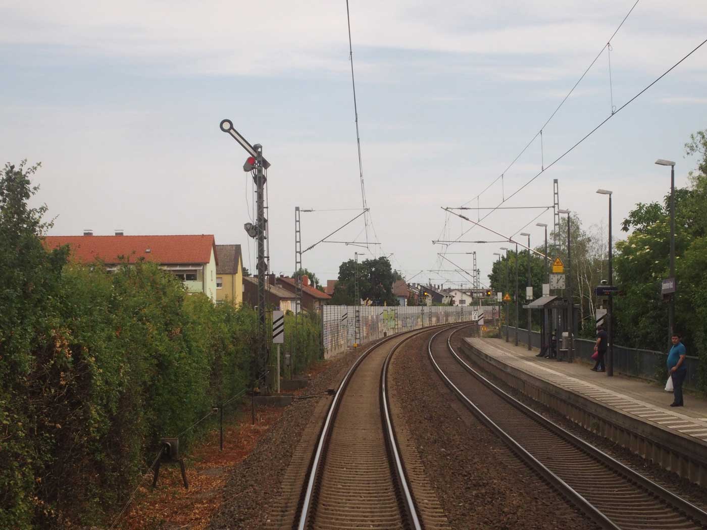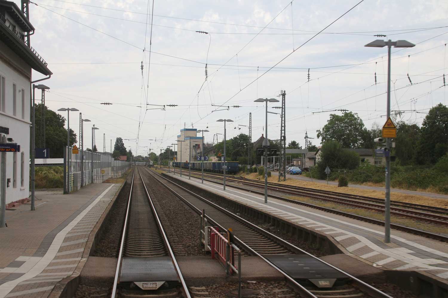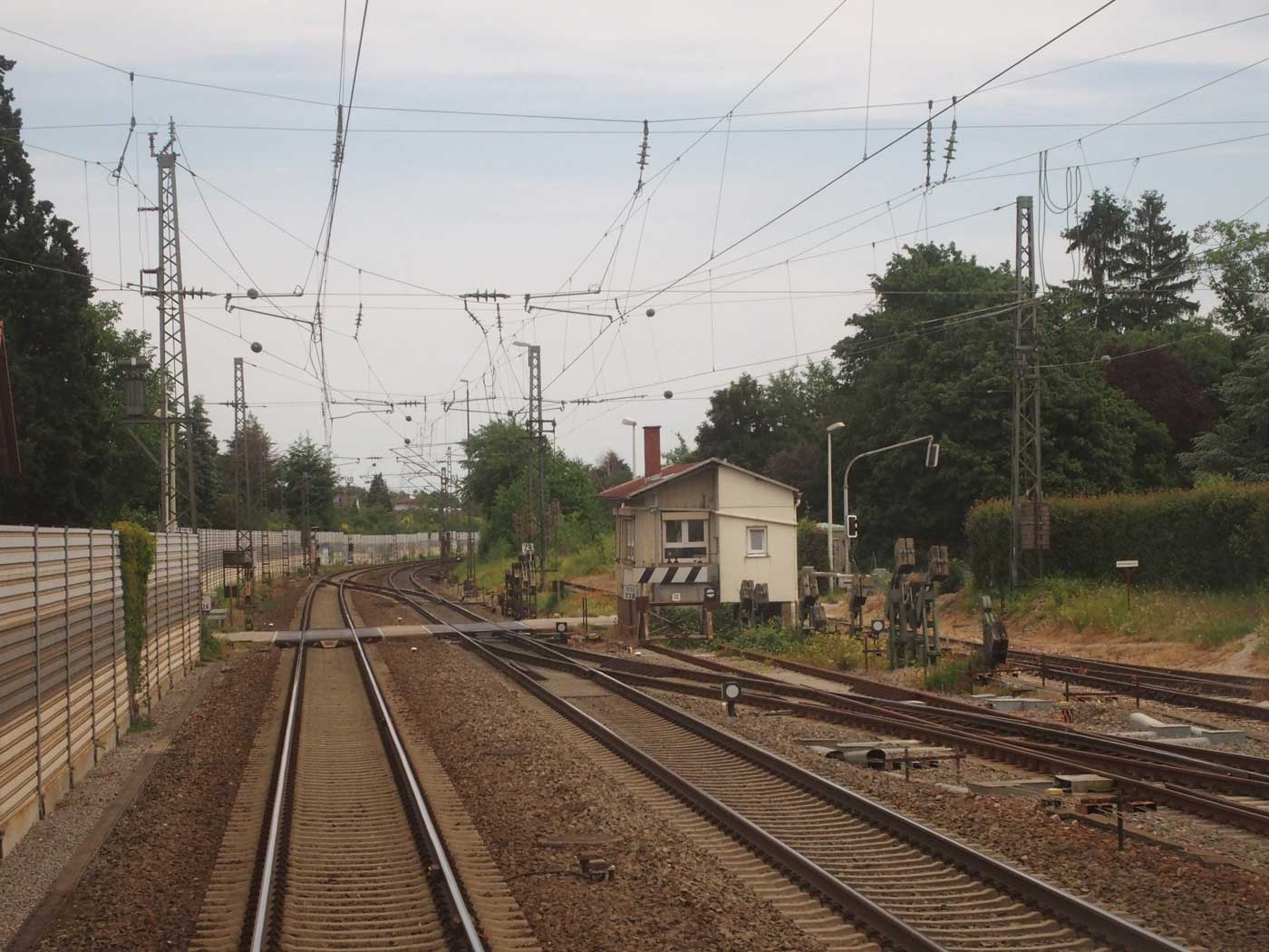 Links am Bahnsteigende km 96,6 der Strecke Mannheim Hbf 0,0 - Heidelberg Hbf (alt) 18,2 (neu) 17,4 = 19,1 - Karlsruhe Hbf 72,90 - Basel Bad. Bf 270,69 - Singen (Hoh) 384,08 - Konstanz 414,34 - Staatsgrenze 414,83