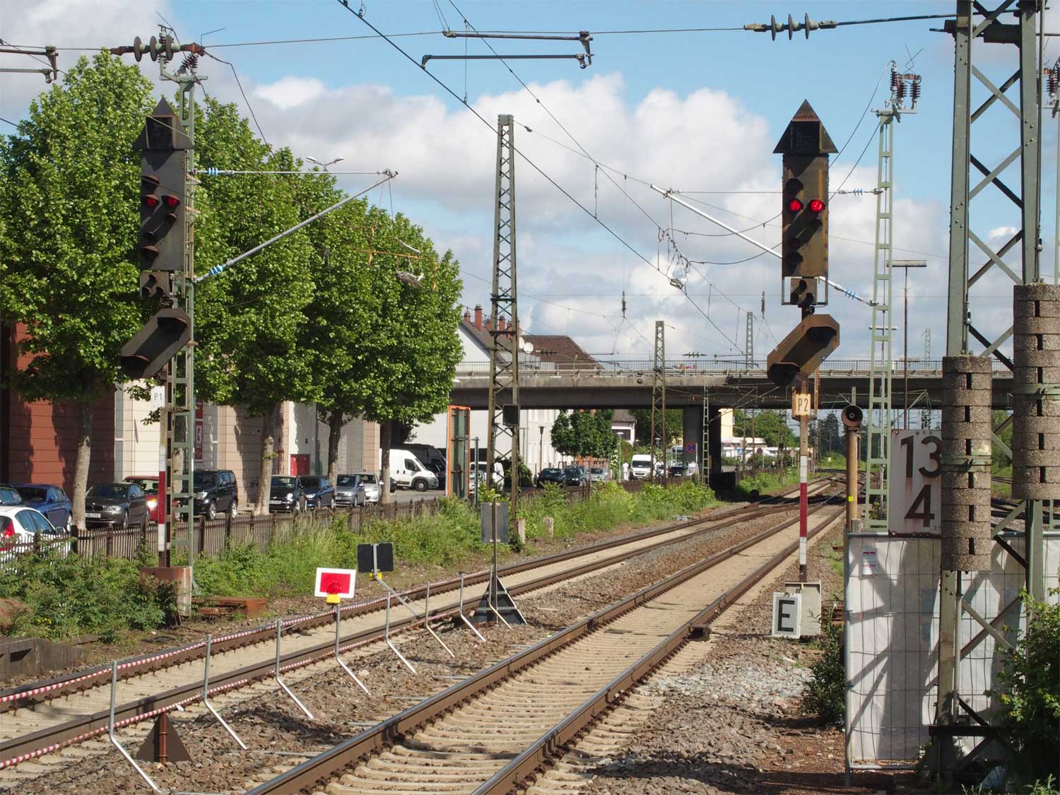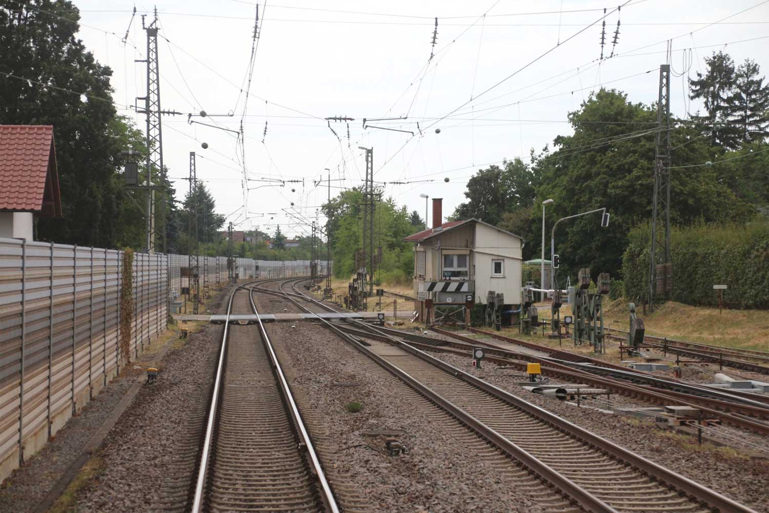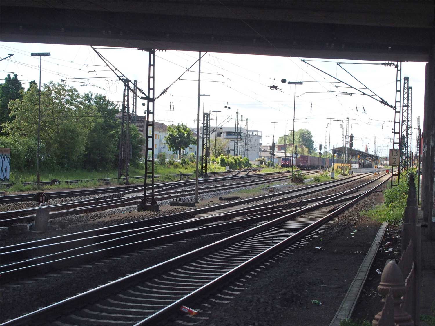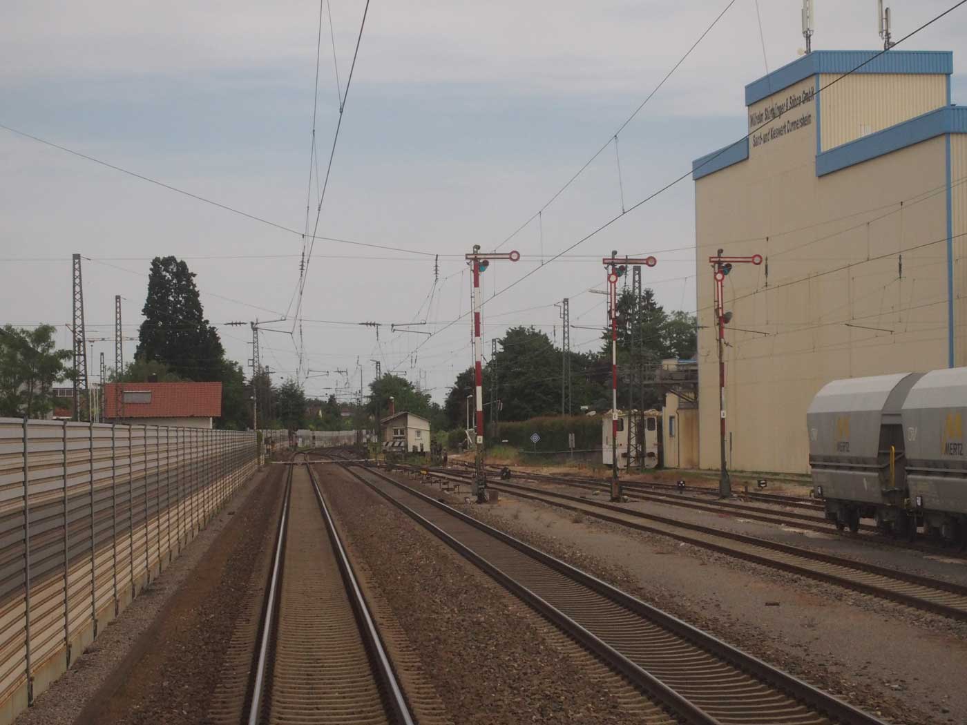 Links am Bahnsteigende km 96,6 der Strecke Mannheim Hbf 0,0 - Heidelberg Hbf (alt) 18,2 (neu) 17,4 = 19,1 - Karlsruhe Hbf 72,90 - Basel Bad. Bf 270,69 - Singen (Hoh) 384,08 - Konstanz 414,34 - Staatsgrenze 414,83