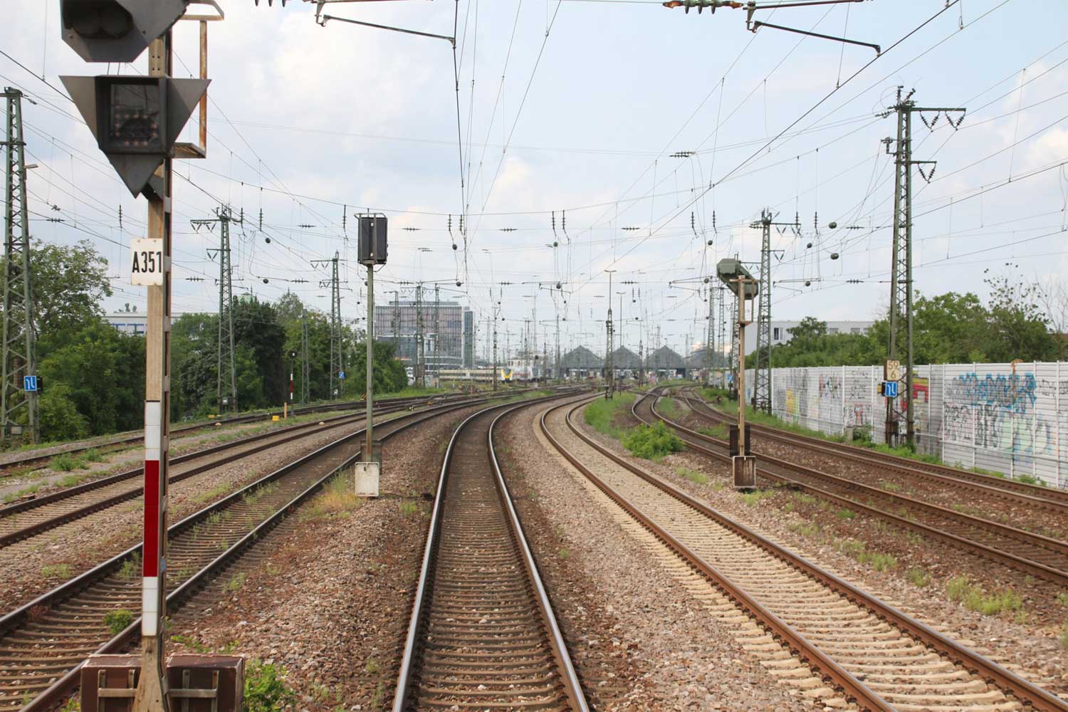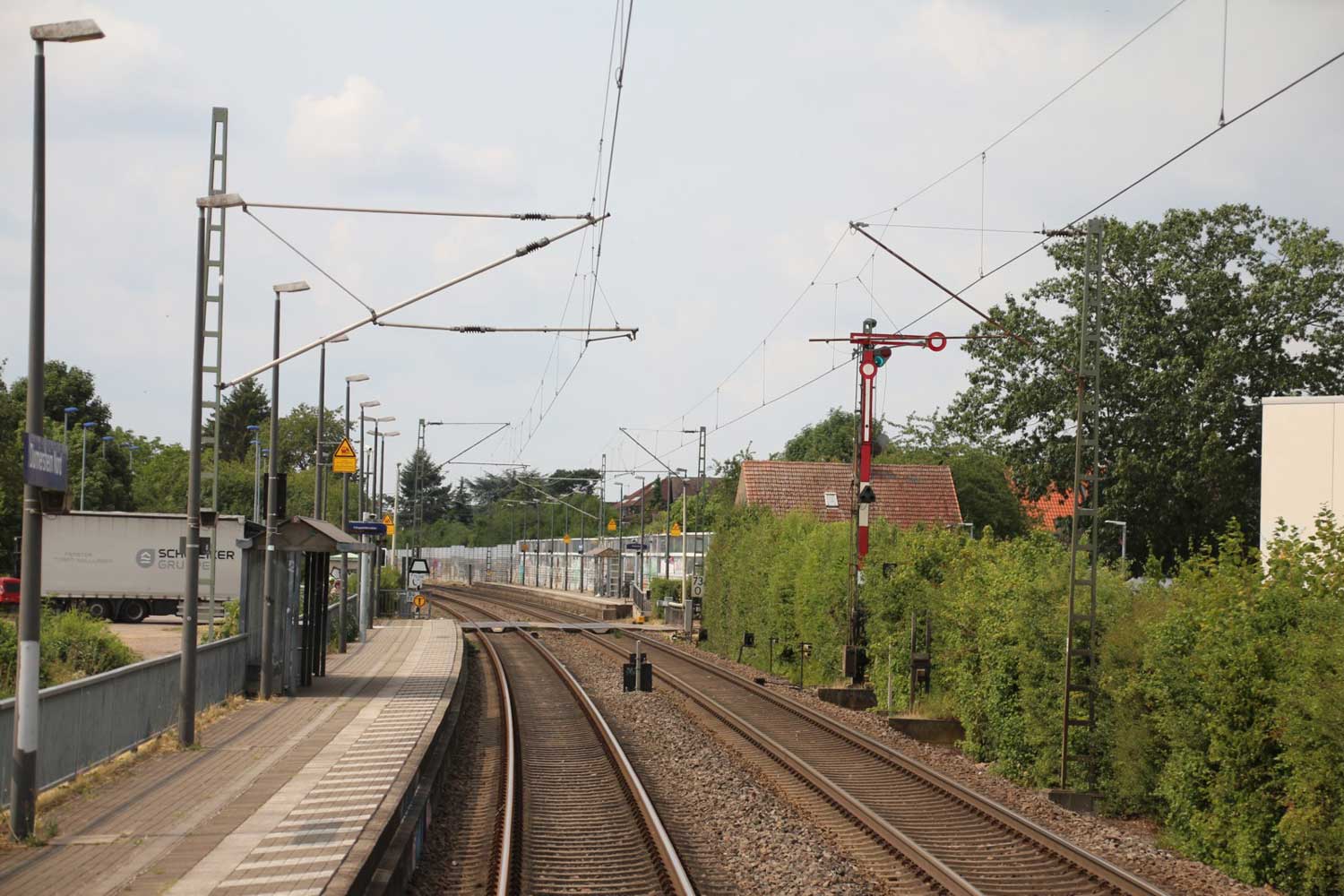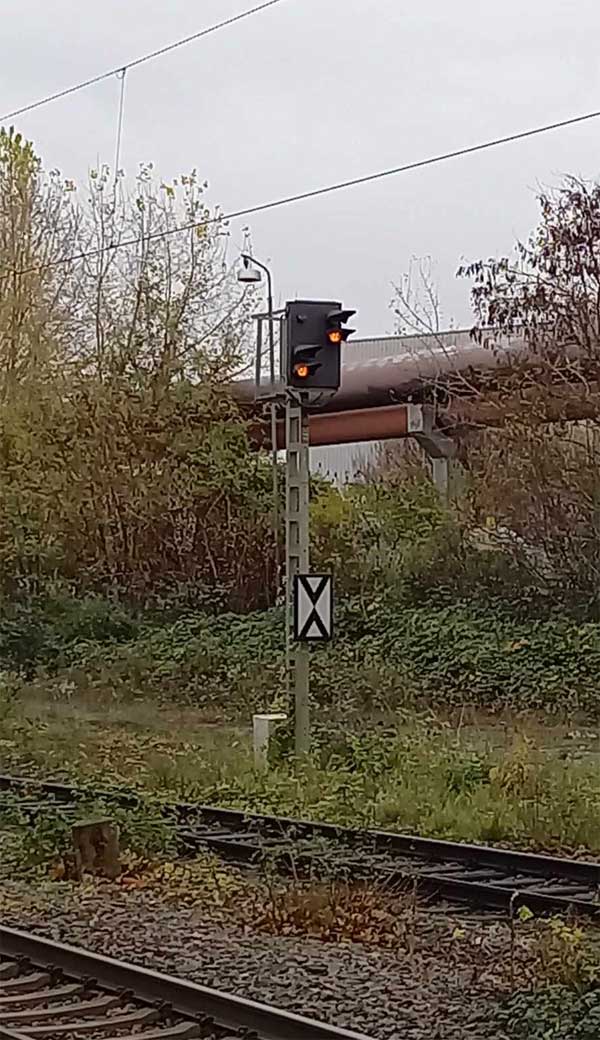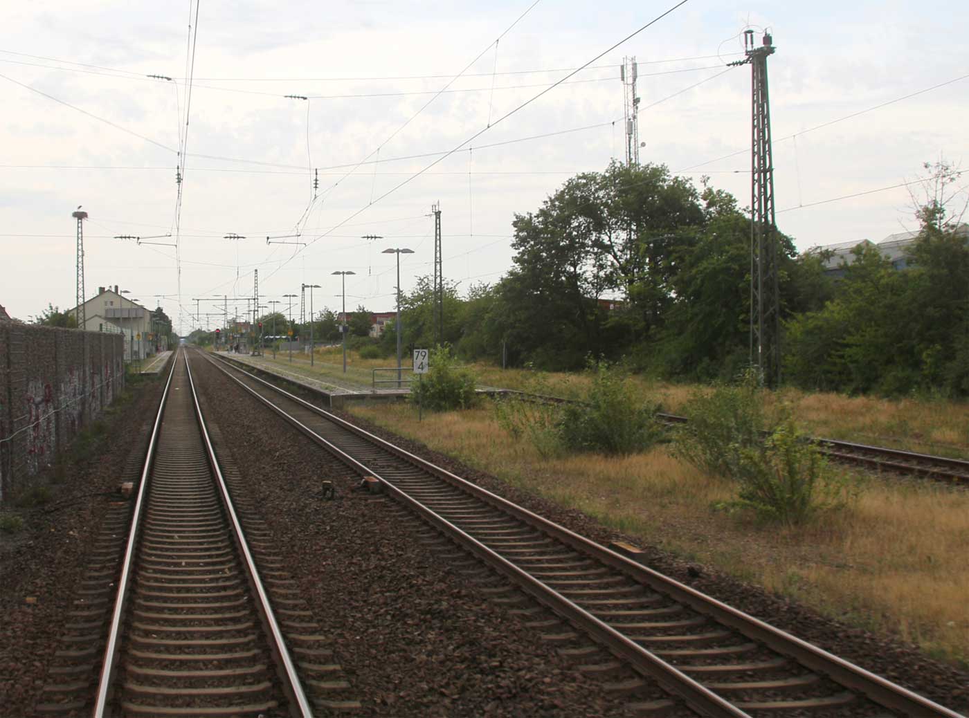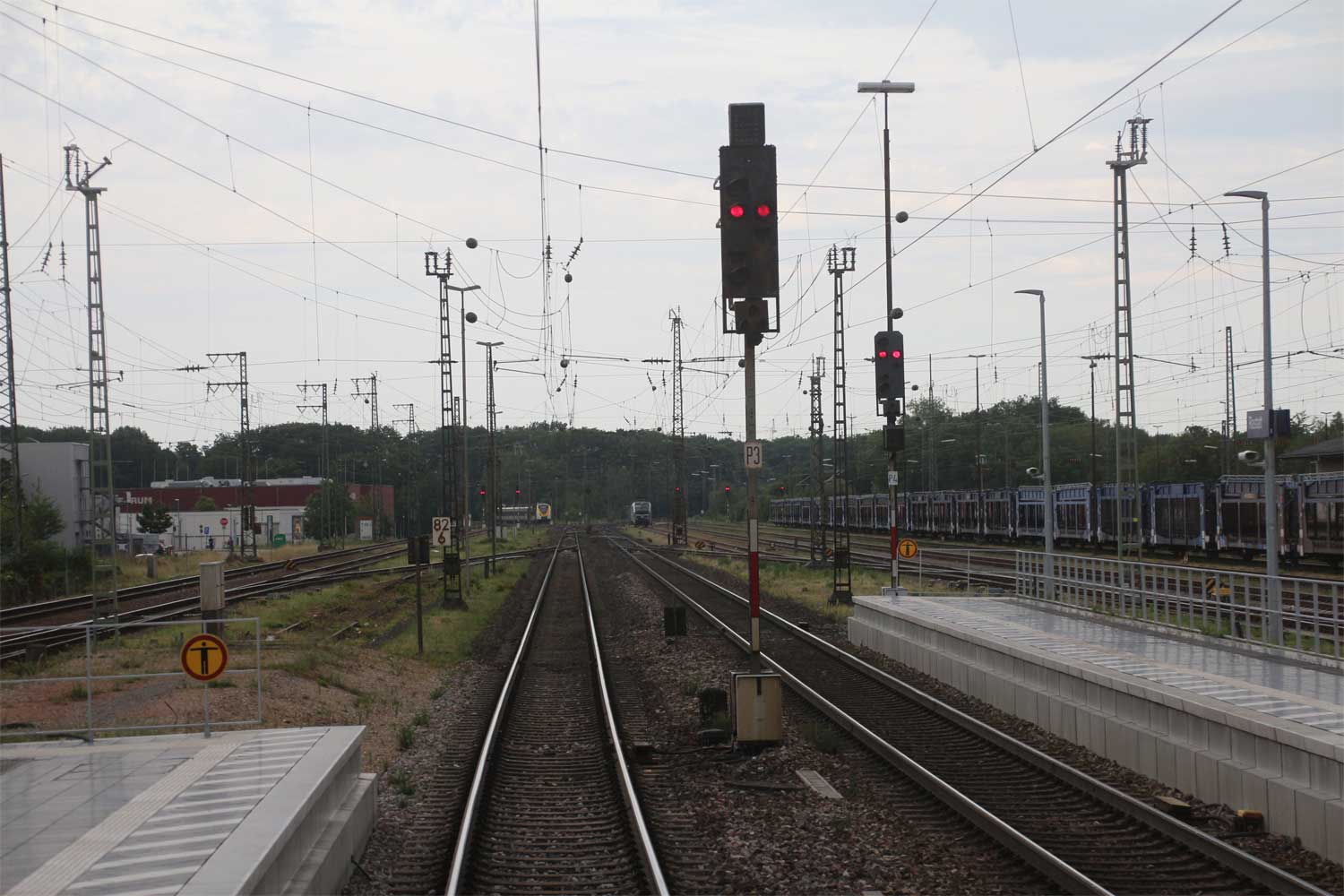Links am Bahnsteigende km 96,6 der Strecke Mannheim Hbf 0,0 - Heidelberg Hbf (alt) 18,2 (neu) 17,4 = 19,1 - Karlsruhe Hbf 72,90 - Basel Bad. Bf 270,69 - Singen (Hoh) 384,08 - Konstanz 414,34 - Staatsgrenze 414,83