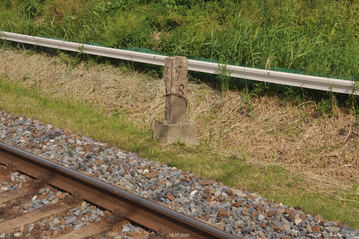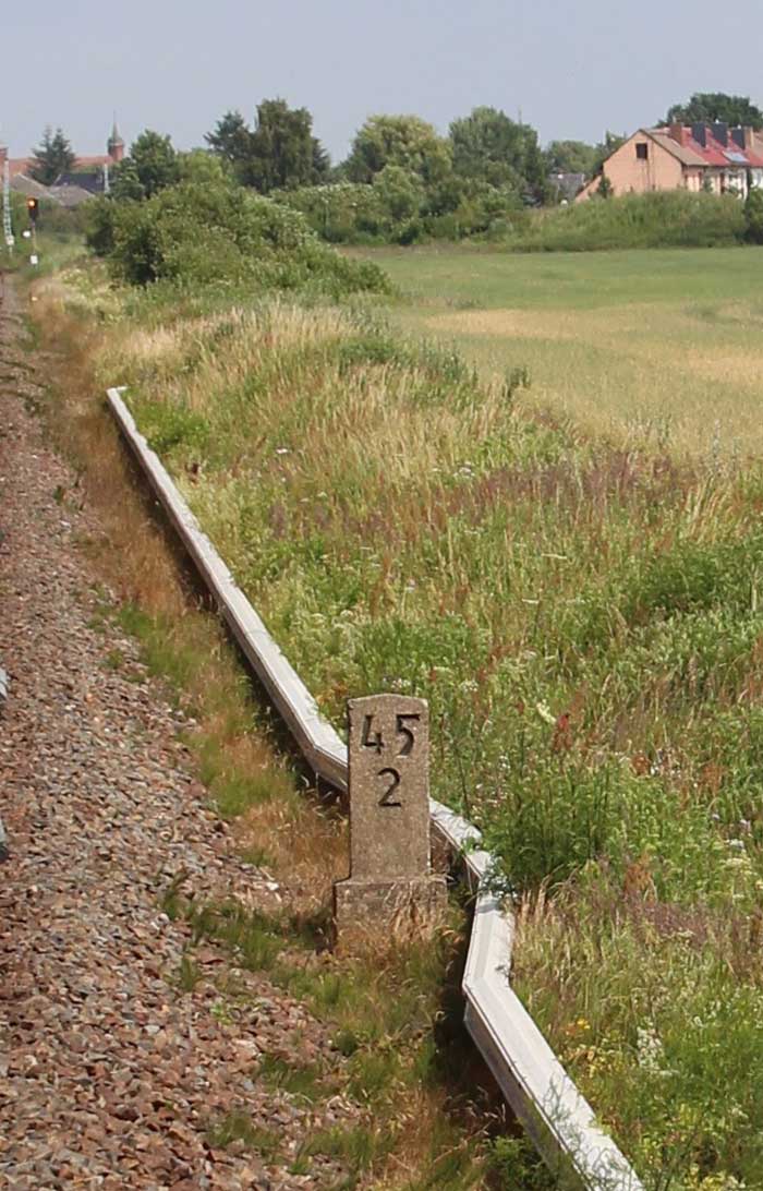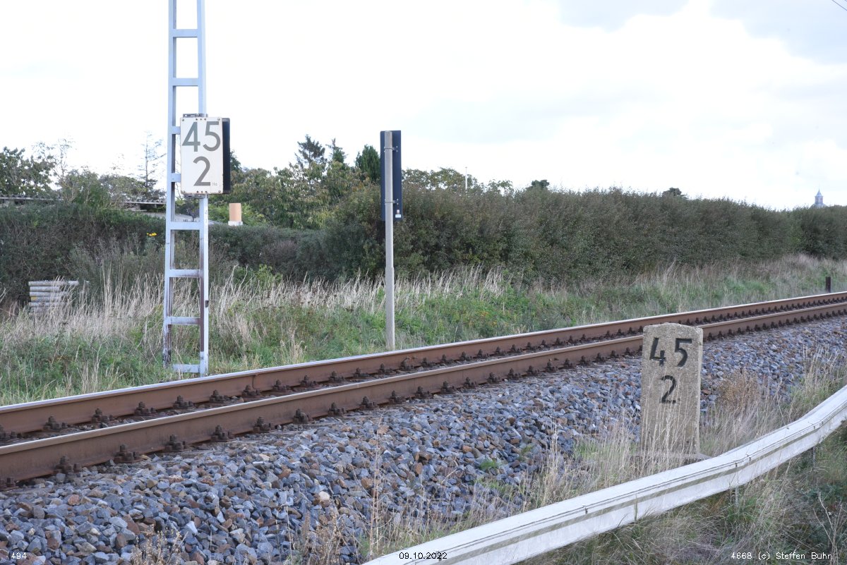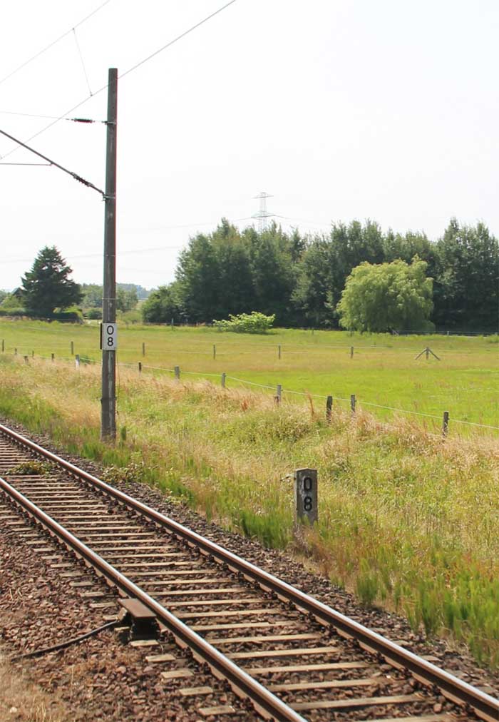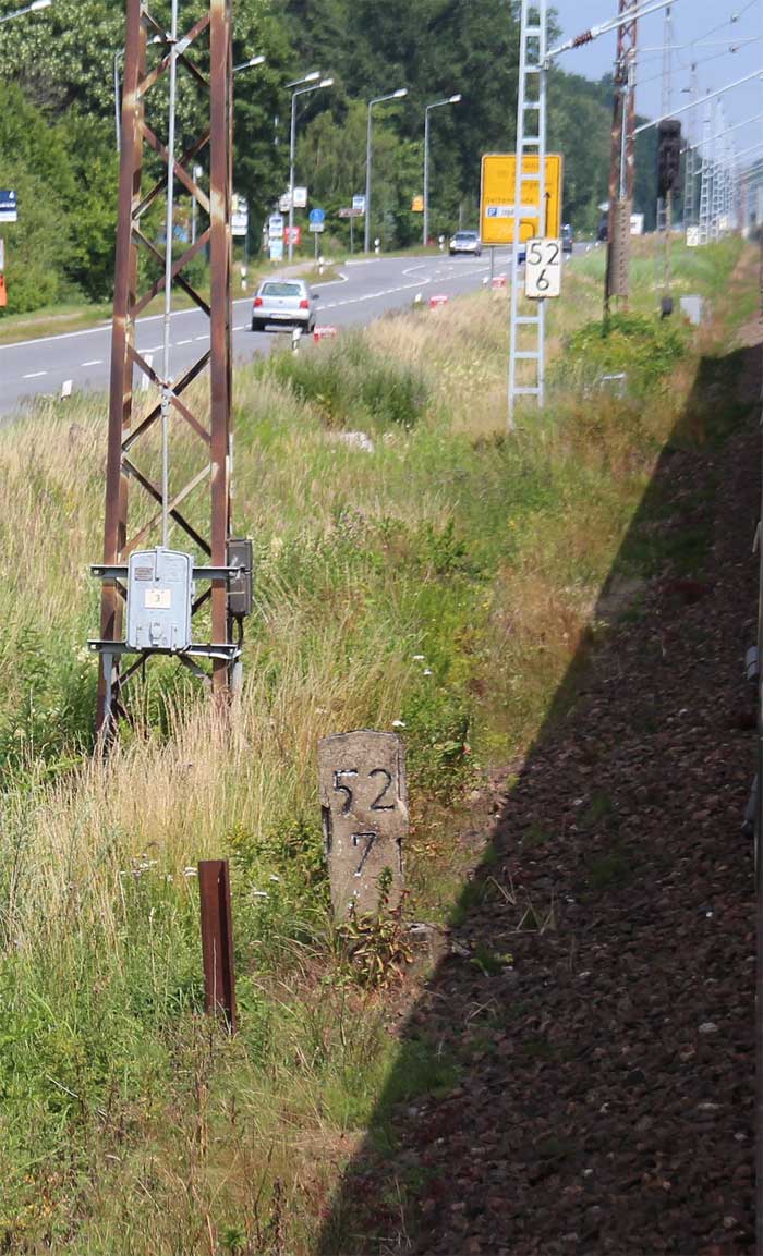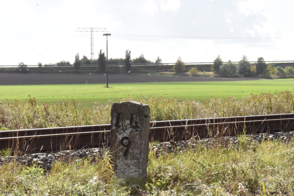 km 1,2 (Tafel und Stein) gehört zur Strecke Abzw Riekdahl, W 1 km 0,87 - Rostock Seehafen Nord km 9,228 (6443)
