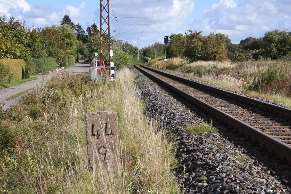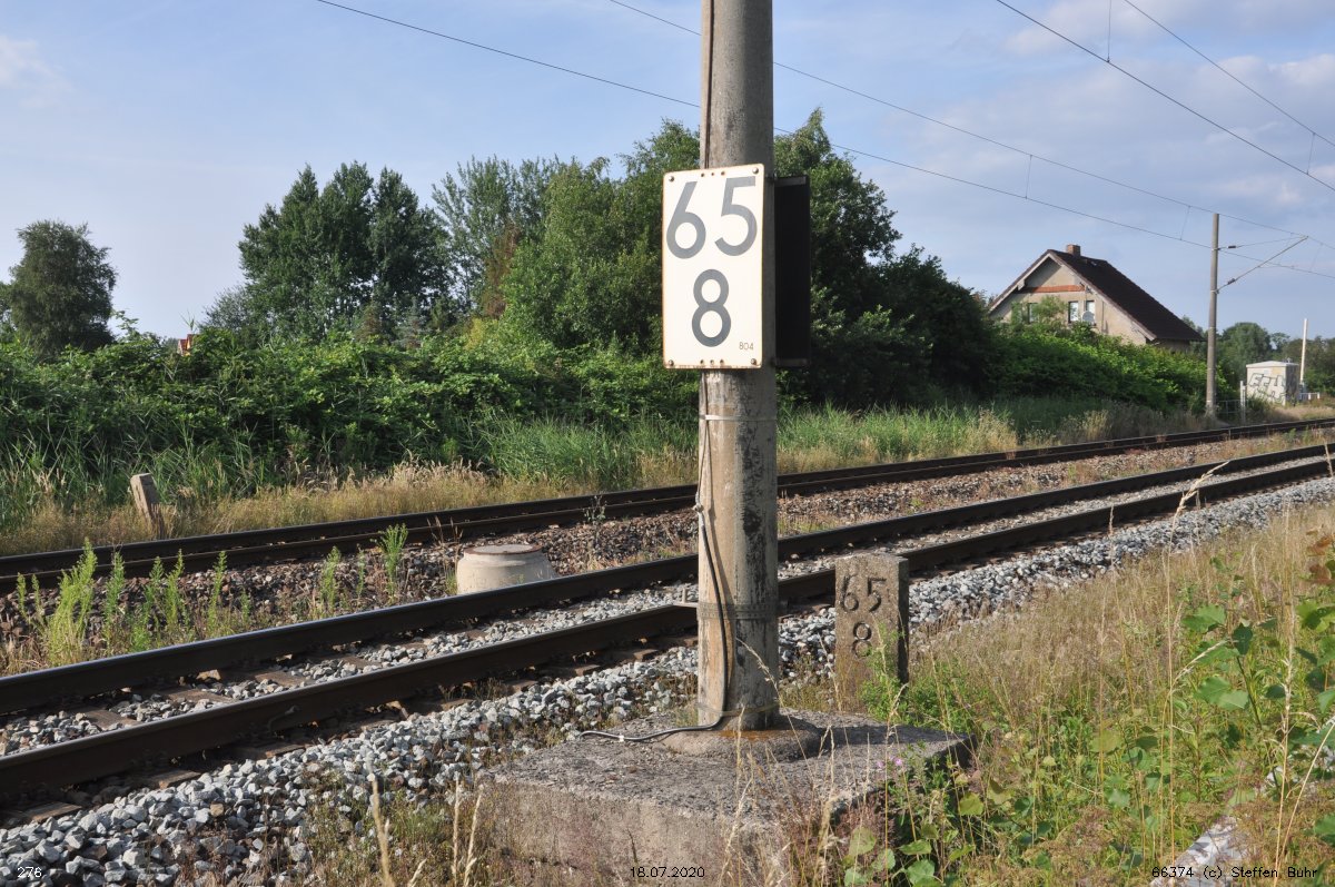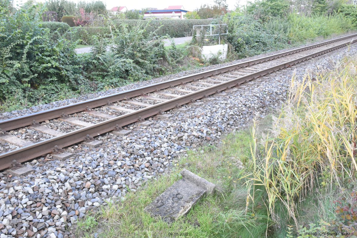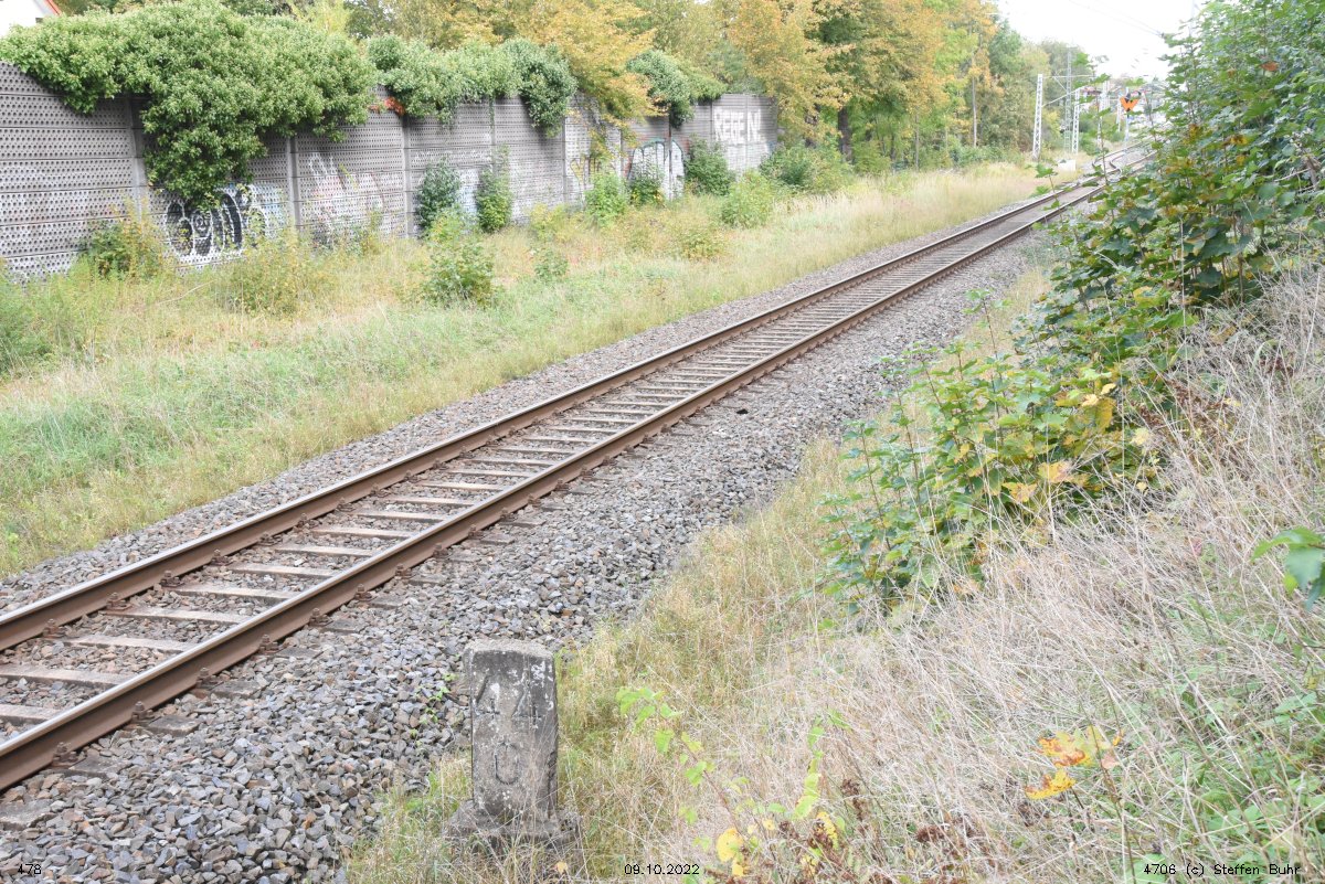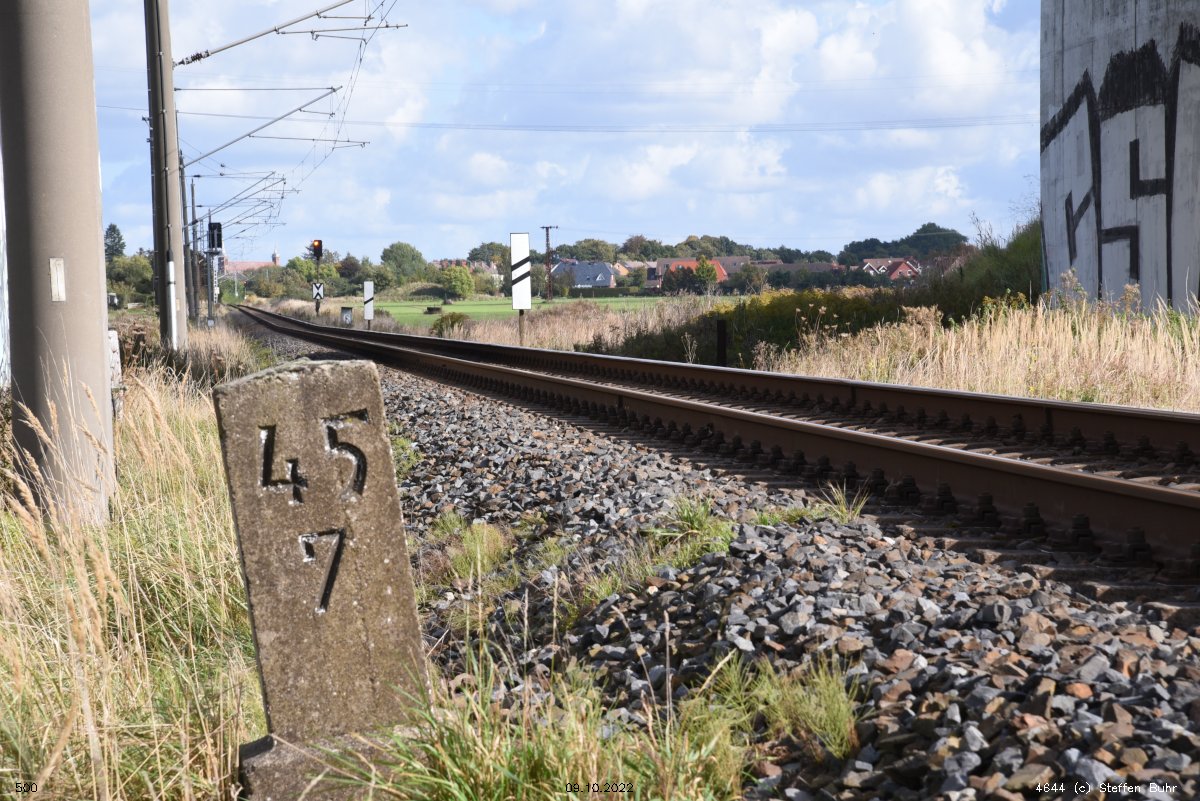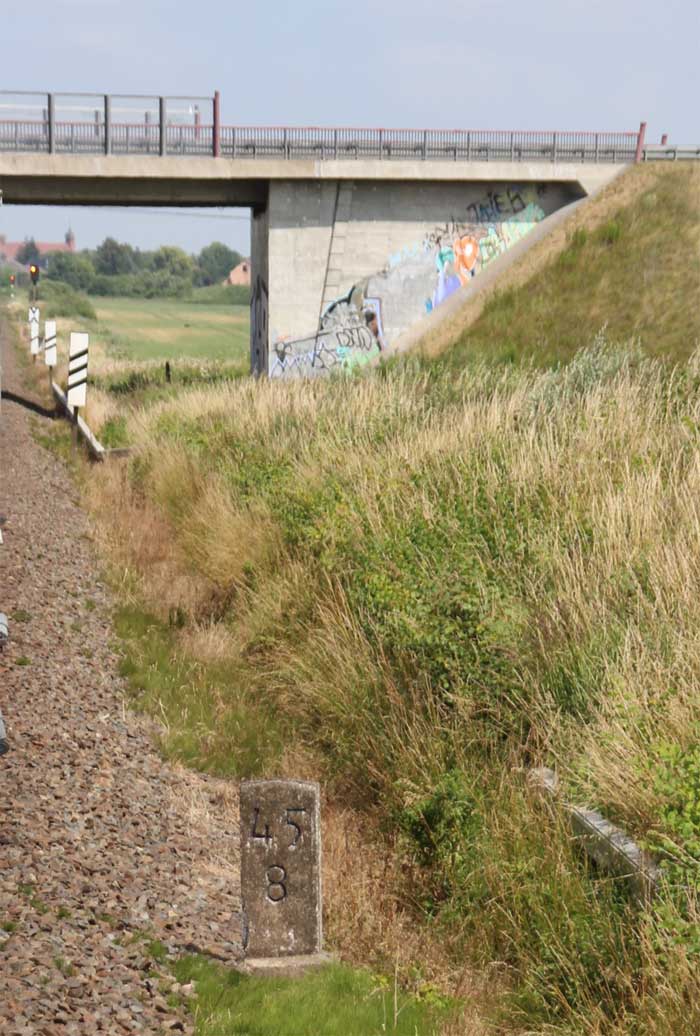km 1,2 (Tafel und Stein) gehört zur Strecke Abzw Riekdahl, W 1 km 0,87 - Rostock Seehafen Nord km 9,228 (6443)
