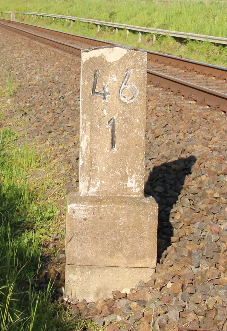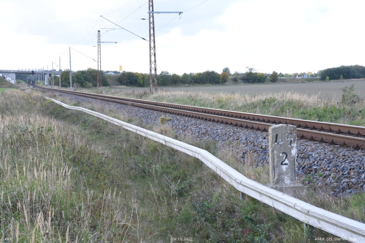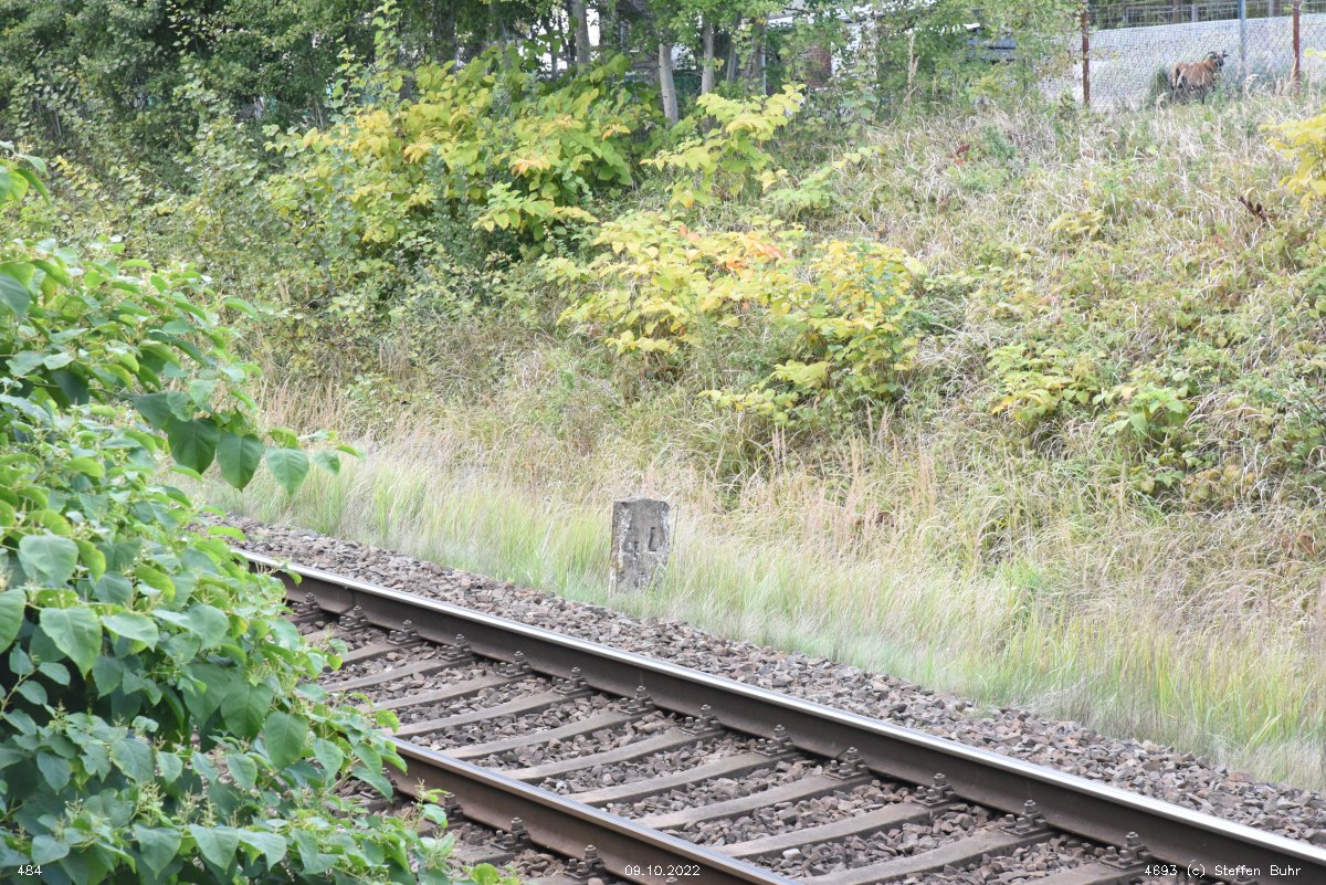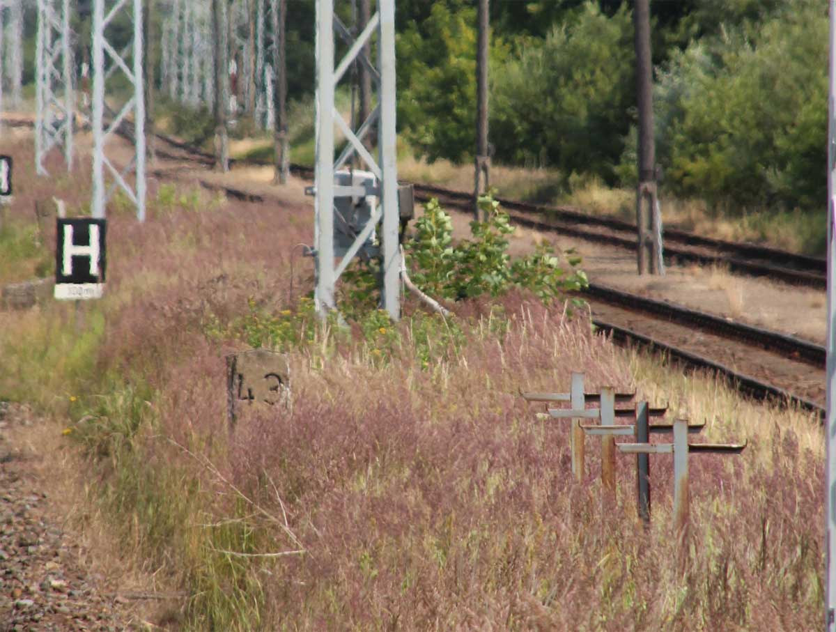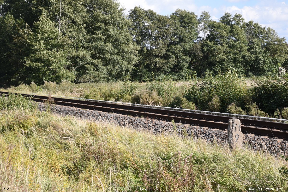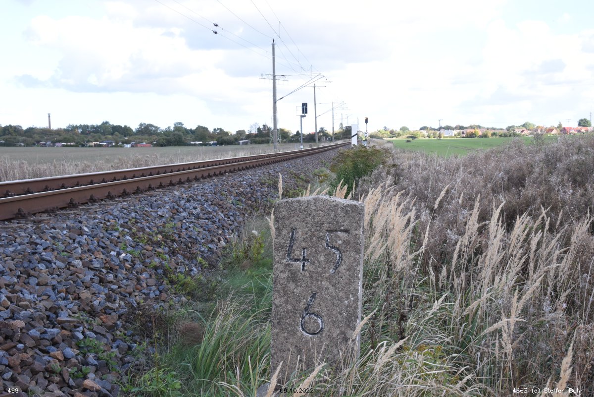 km 1,2 (Tafel und Stein) gehört zur Strecke Abzw Riekdahl, W 1 km 0,87 - Rostock Seehafen Nord km 9,228 (6443)