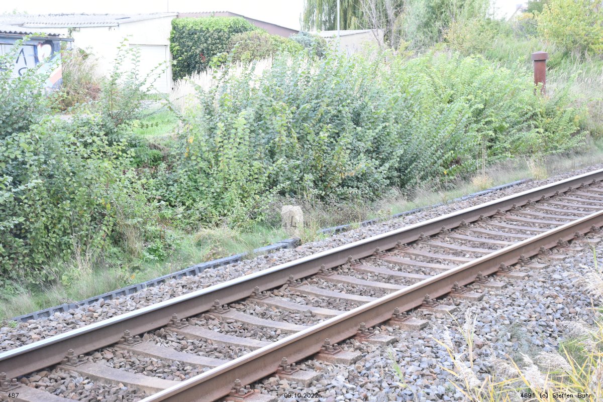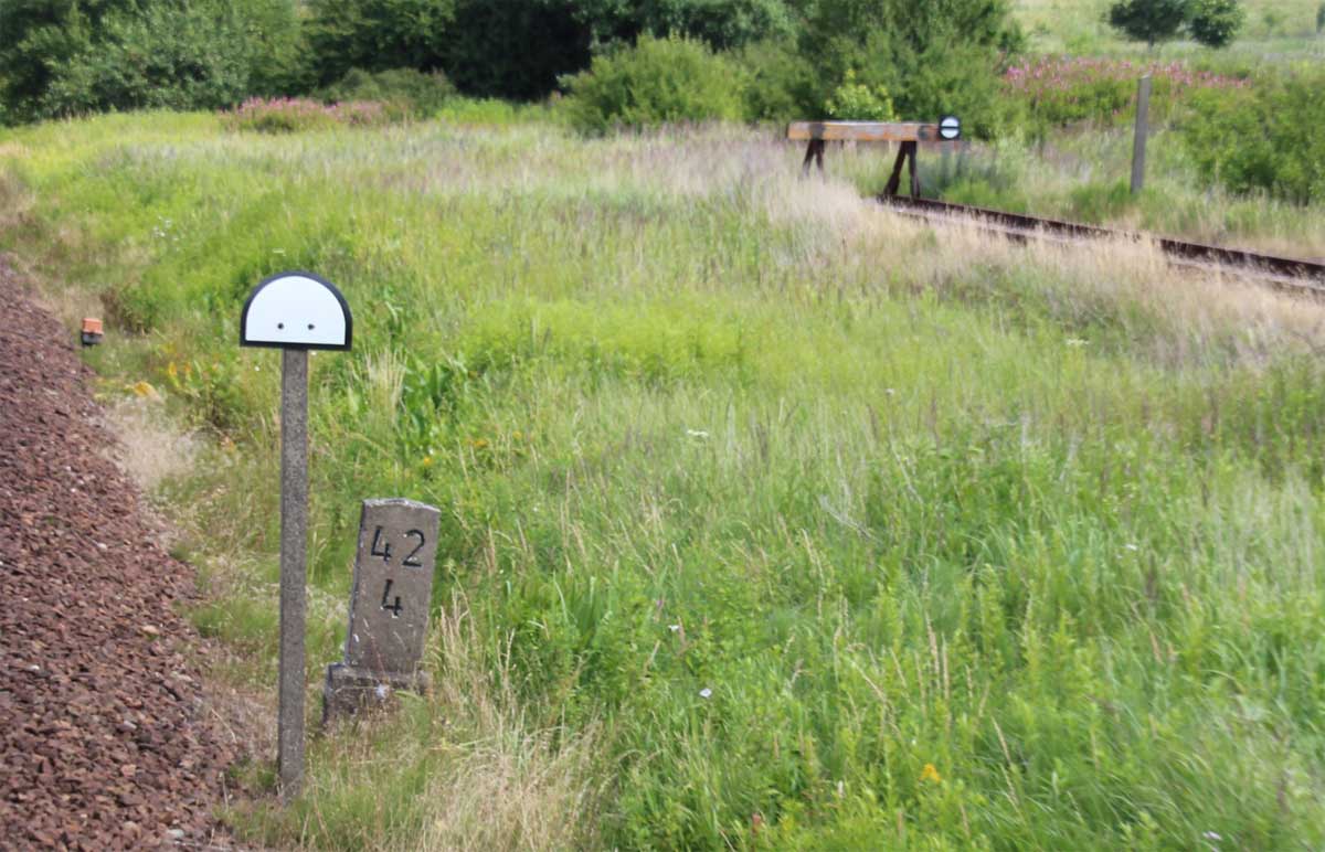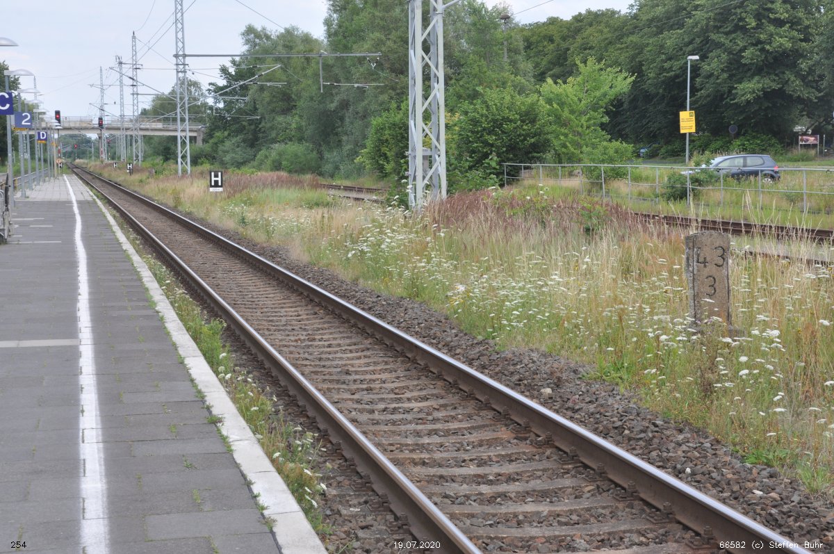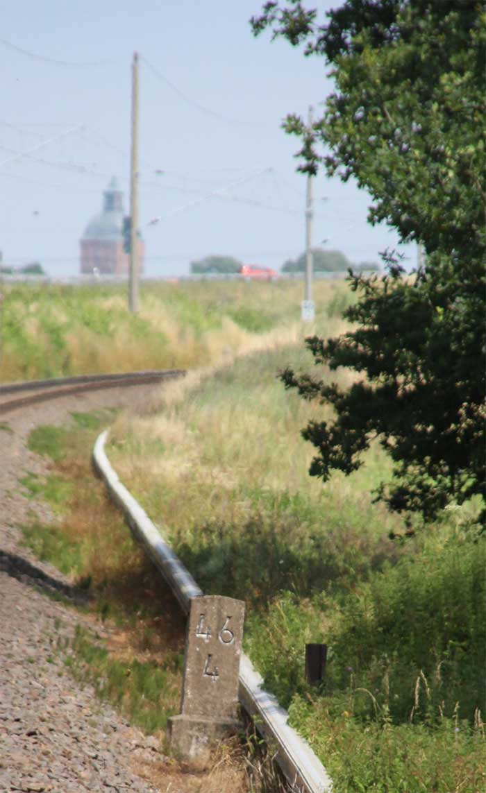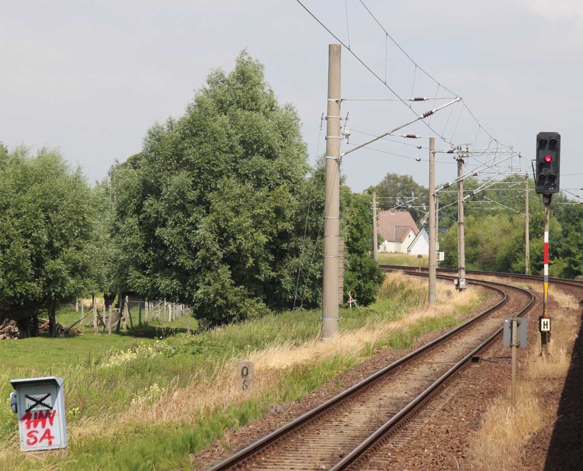 km 1,2 (Tafel und Stein) gehört zur Strecke Abzw Riekdahl, W 1 km 0,87 - Rostock Seehafen Nord km 9,228 (6443)