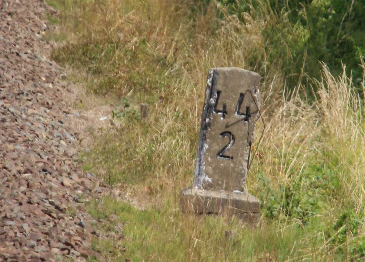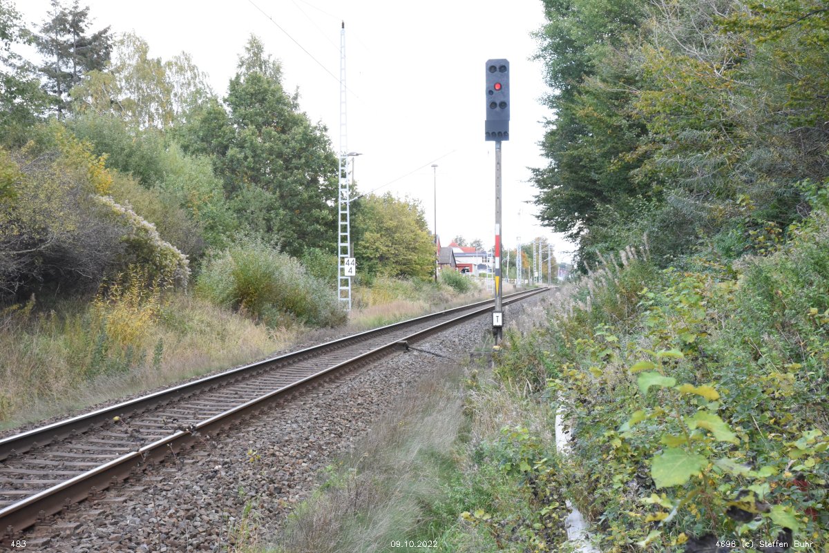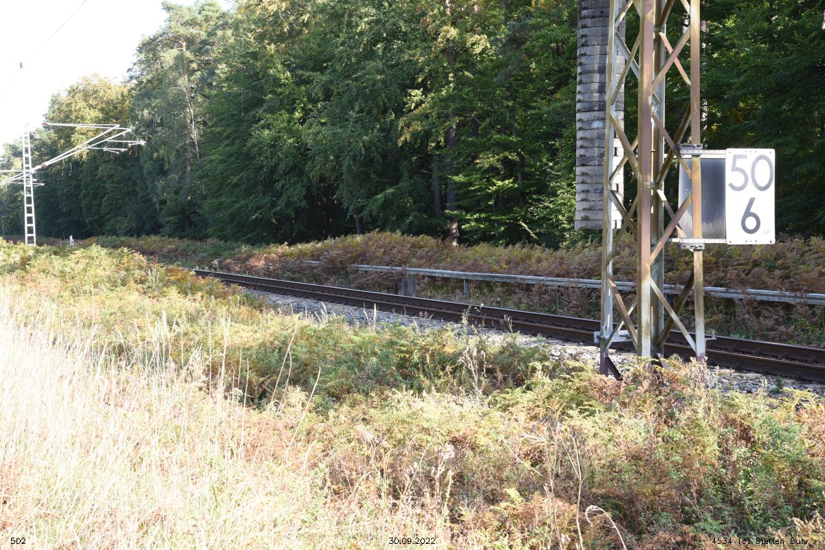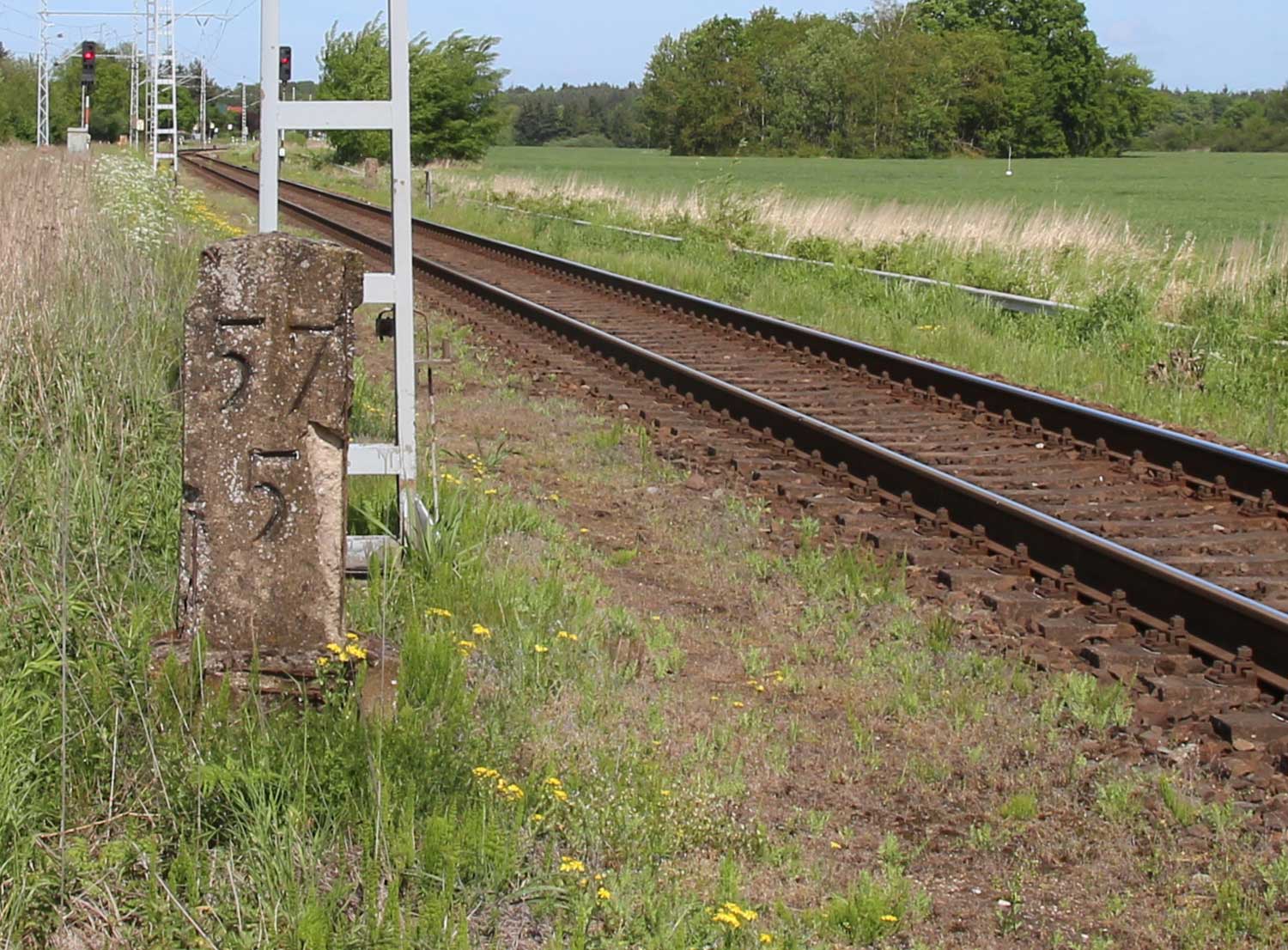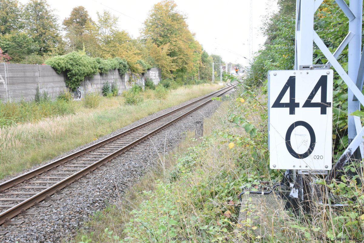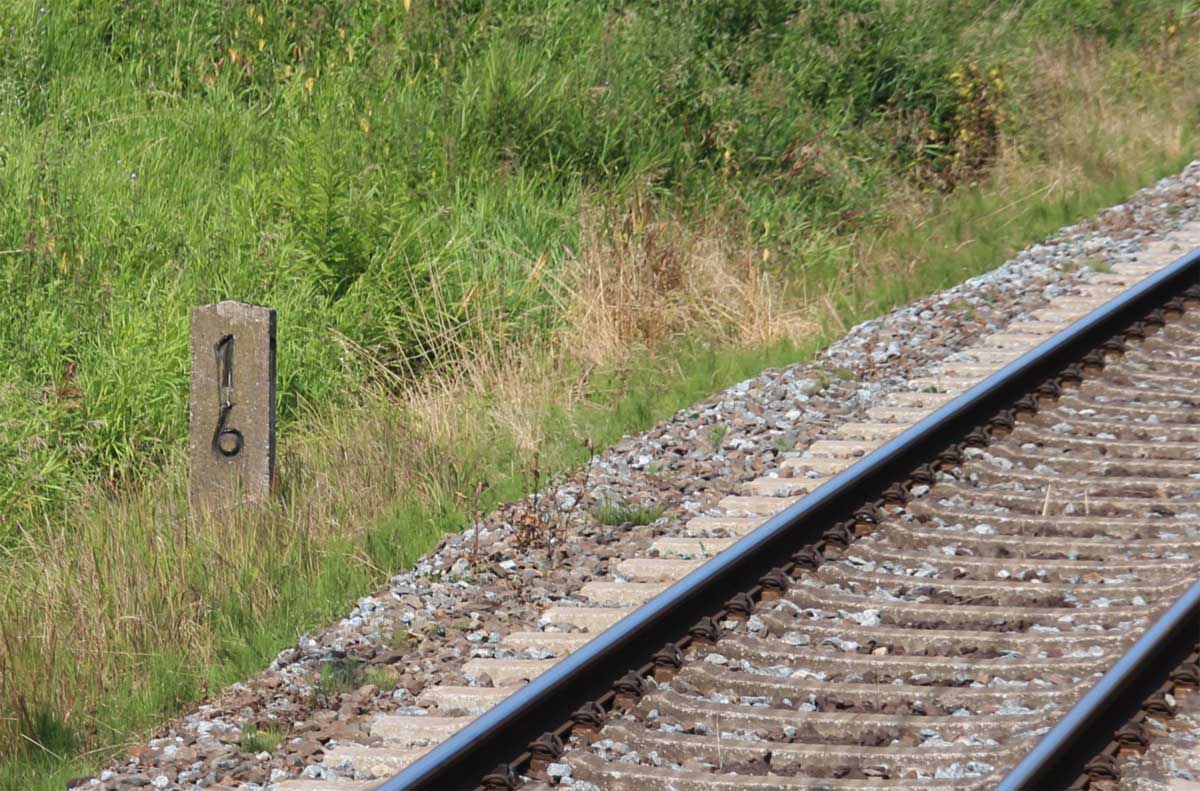 km 1,2 (Tafel und Stein) gehört zur Strecke Abzw Riekdahl, W 1 km 0,87 - Rostock Seehafen Nord km 9,228 (6443)