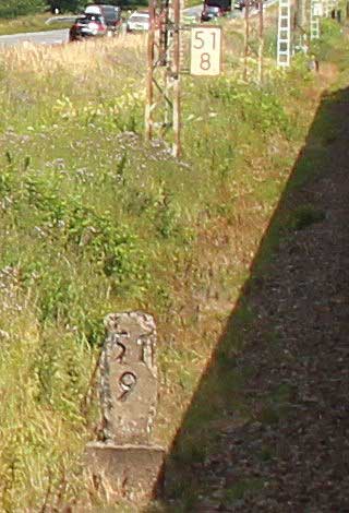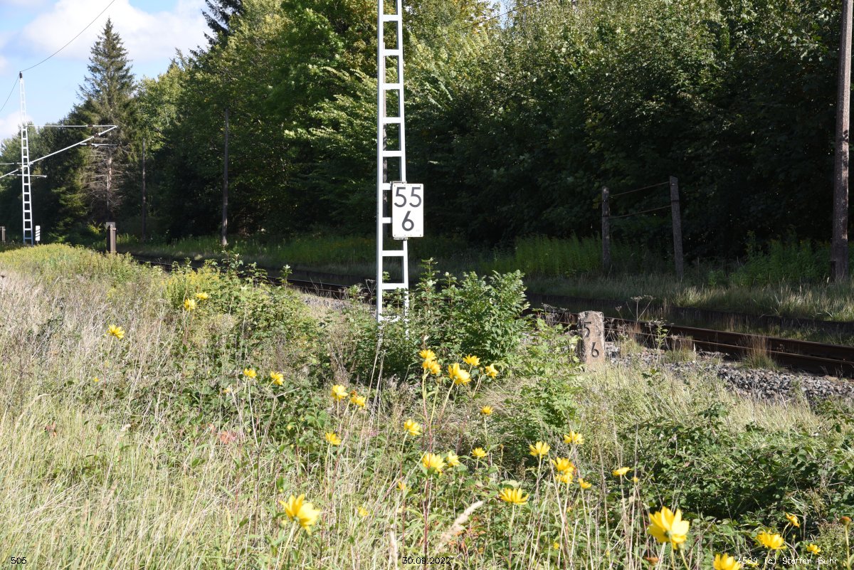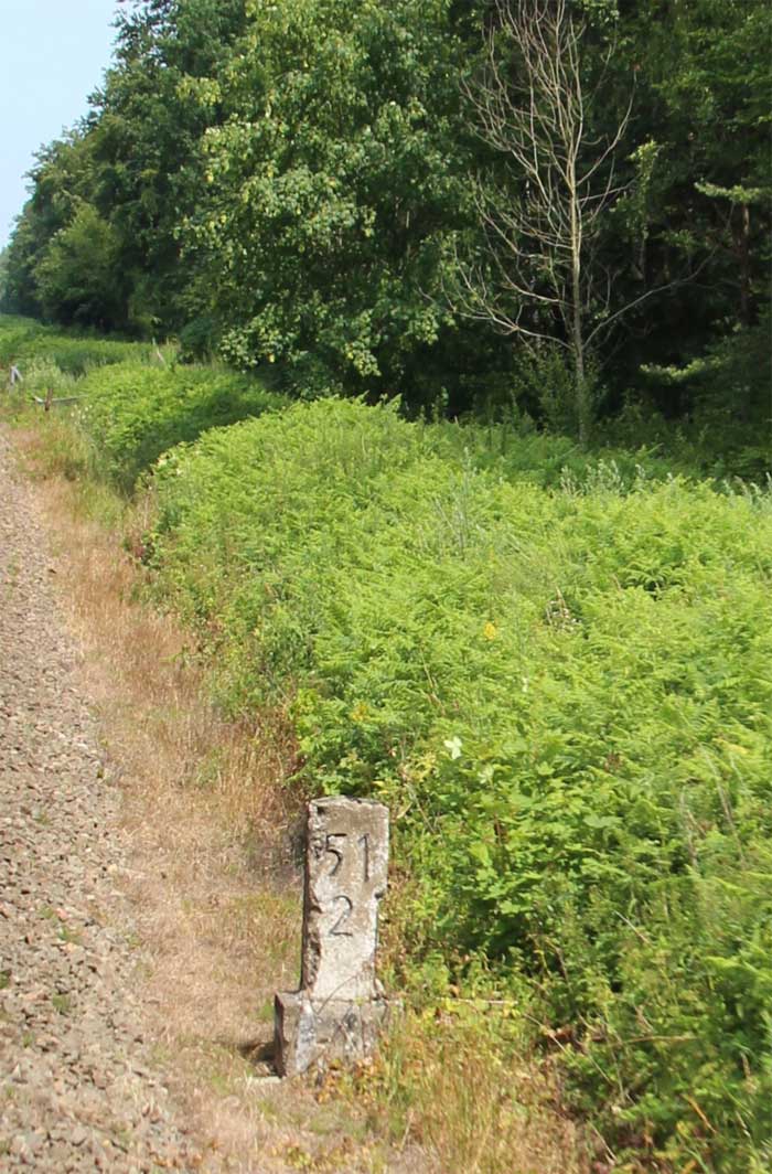 km 0,6 (Tafel); km 0,7 (Stein); km 0,8 (Tafel und Stein) und km 0,9 (Stein) gehören zur Strecke