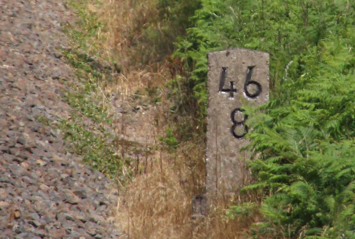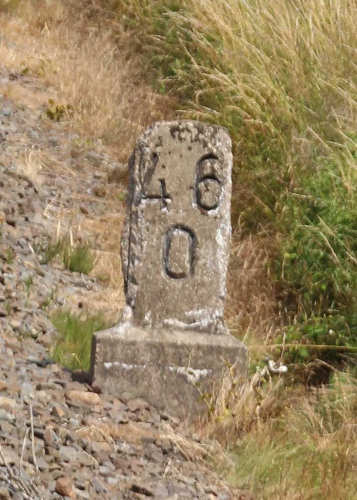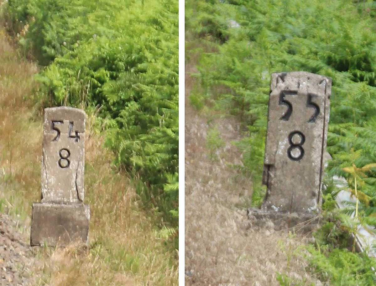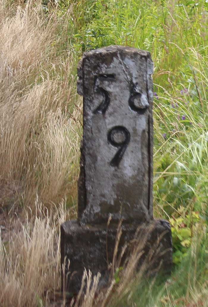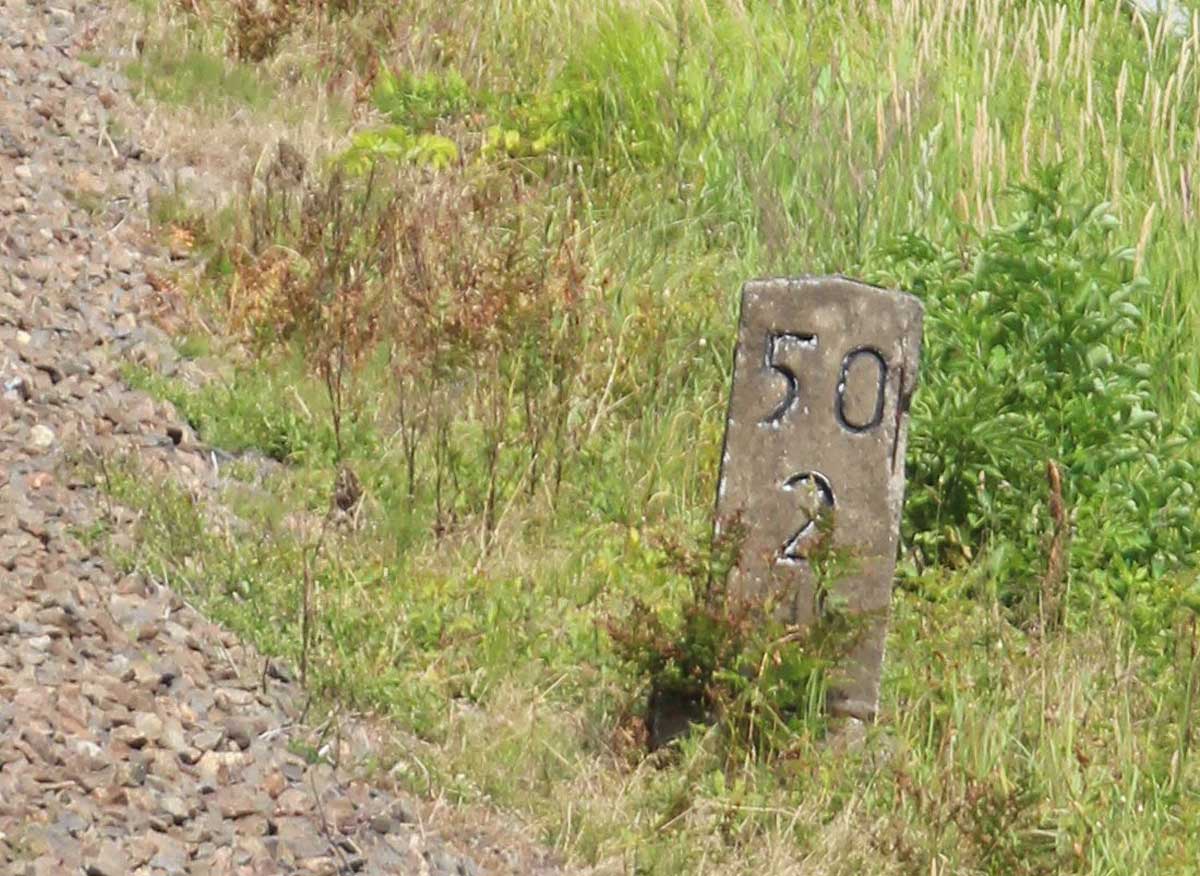 km 0,6 (Tafel); km 0,7 (Stein) und km 0,8 (Tafel und Stein) gehören zur Strecke