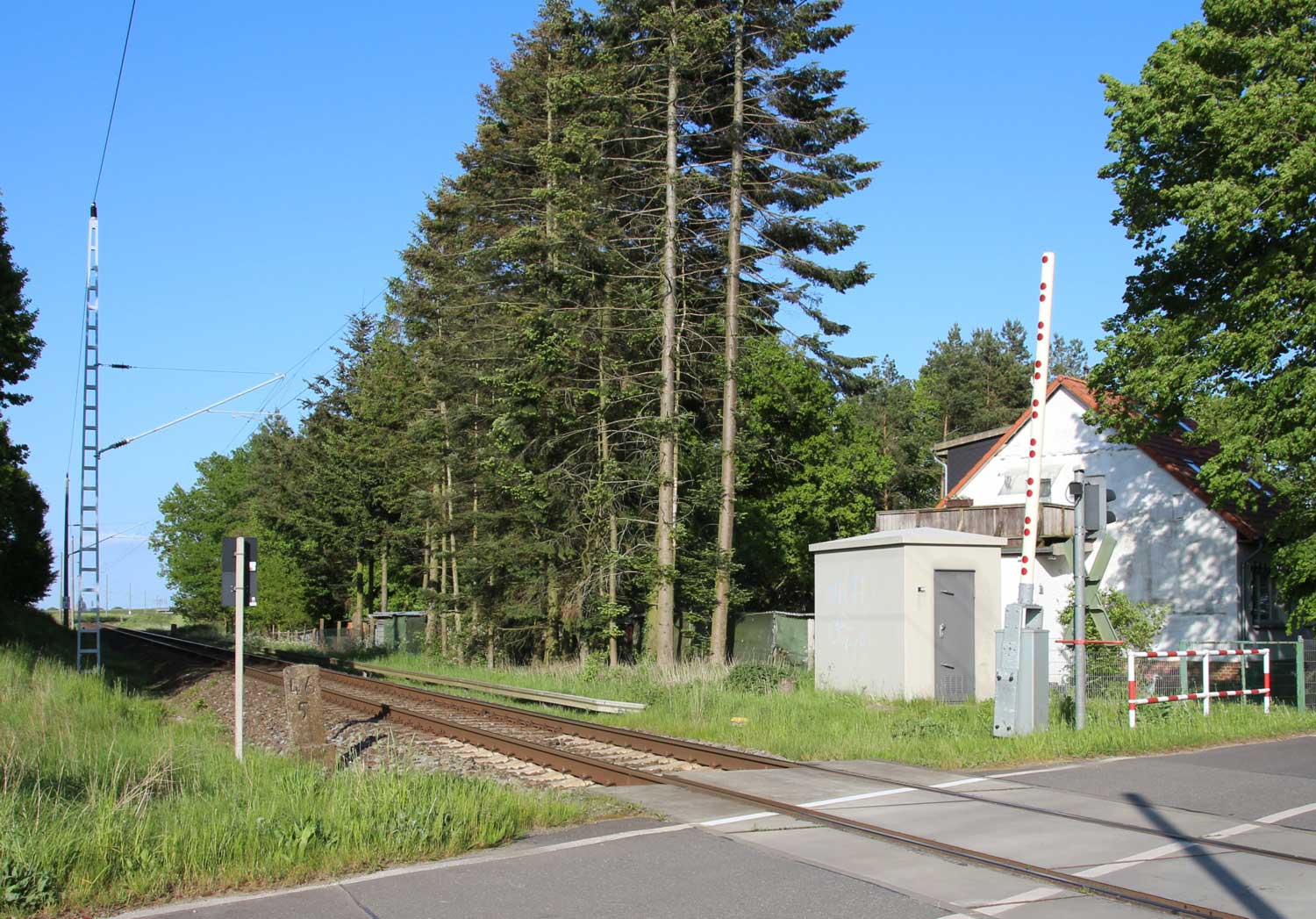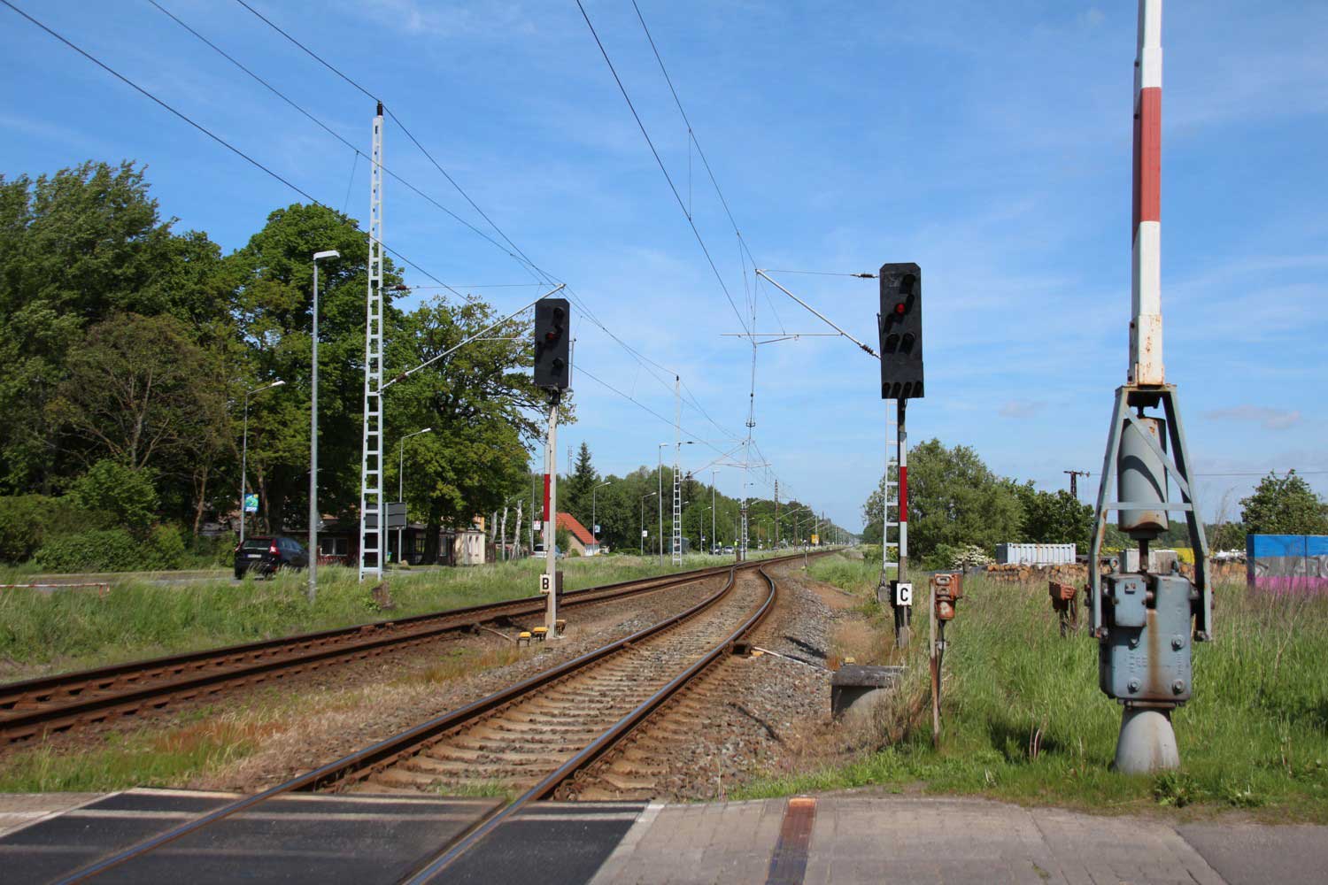 km 68,0 (Tafel) und BÜ km 68,1 zwischen Bentwisch und Abzw Riekdahl - Blick Richtung Stralsund