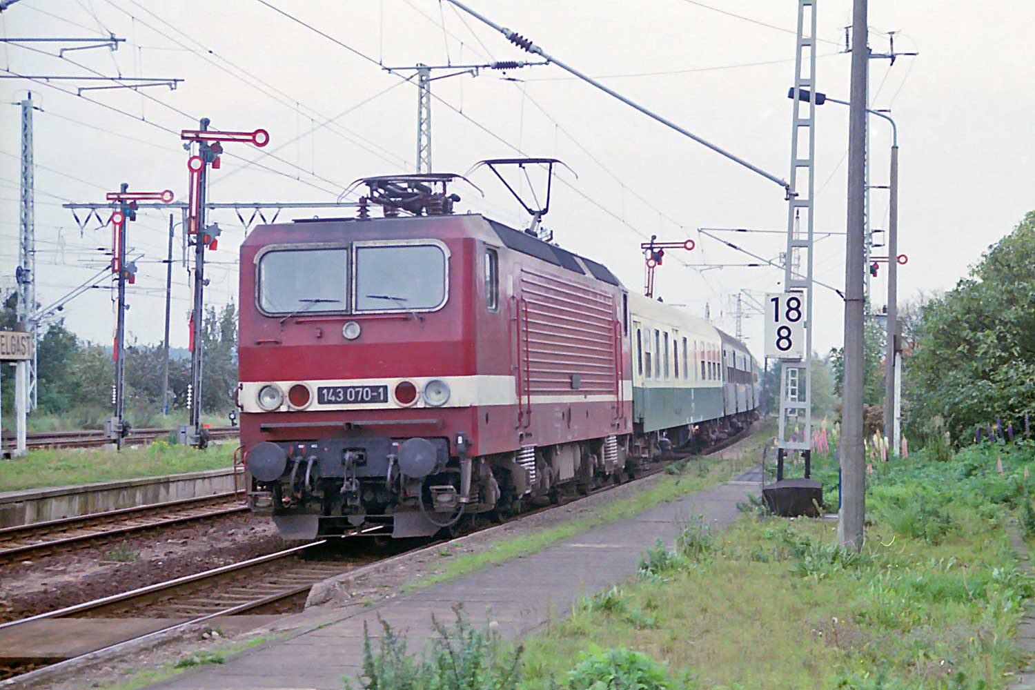km 240,80 der Strecke (Berlin Nordbf -0,28) - Grenze DDR/Berlin West 0,7 - Grenze Berlin West/DDR (Streckenunterbrechung) - Berlin-Pankow 5,60 - Angermünde 70,67 - Jatznick 142,88 - Ducherow 163,19 - Züssow 191,90 - Greifswald 209,60 - Stralsund 240,80 | ||