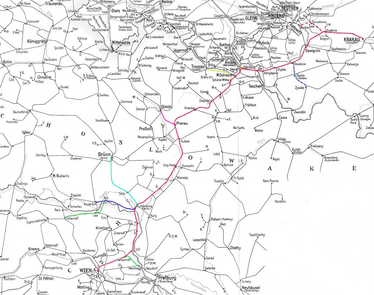 Wien Nord (Wien Praterstern) 0,1 - Staatsgrenze Österreich/Tschechien 77,992 - Lundenburg (Břeclav) 83,131 - Prerau (Přerov) 183,453 - Mährisch Weißkirchen (Hranice na Moravě) 211,86 - Grenze Protektorat Böhmen und Mähren/Deutschland 214,250 - Zauchtel (Oder) (Suchdol nad Odrou) 232,661 - Stauding (Studénka) 244,70 - Oderberg (Bohumín) 275,91 - Dzieditz (Czechowice-Dziedzice) 326,66 - Auschwitz (Oświęcim) 348,05 - Trzebinia 373,29 - Krakau Hbf (Kraków Głowny) 412,35