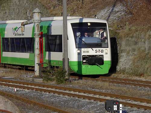 Im Bahnhof Lauscha steht abfahrbereit der Triebwagen der STB in Richtung Neuhaus am Rennweg |