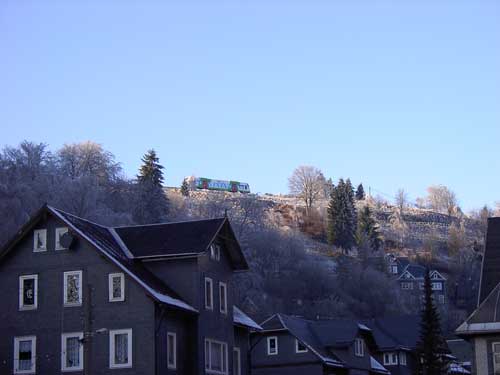 Auf seiner Fahrt vom Bahnhof Lauscha auf die Höhe hat der