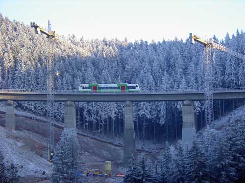 Triebwagen den Lauschastein-Tunnel durchfahren und überquert ein Jahr nach