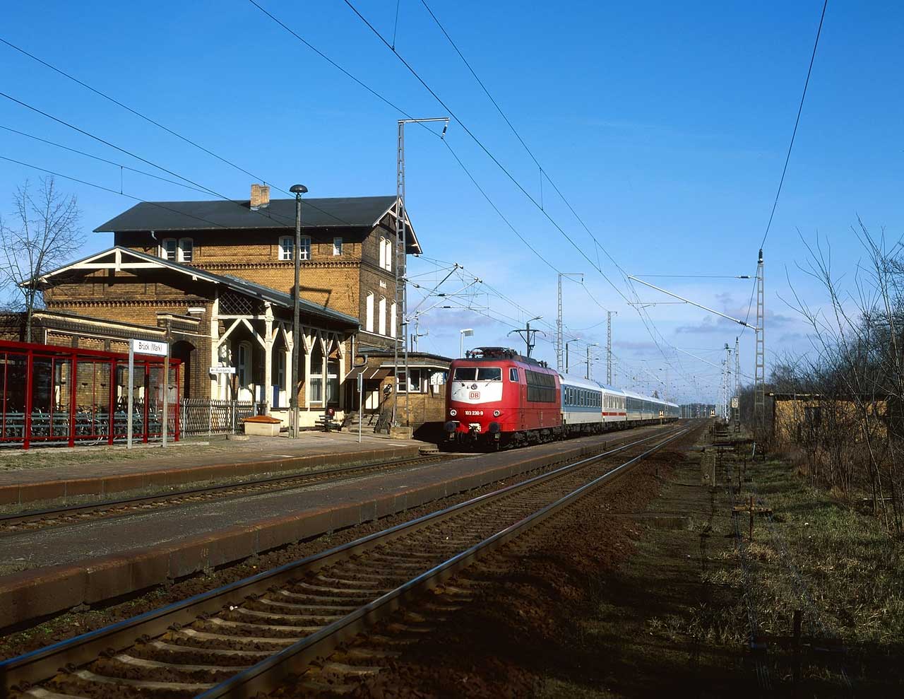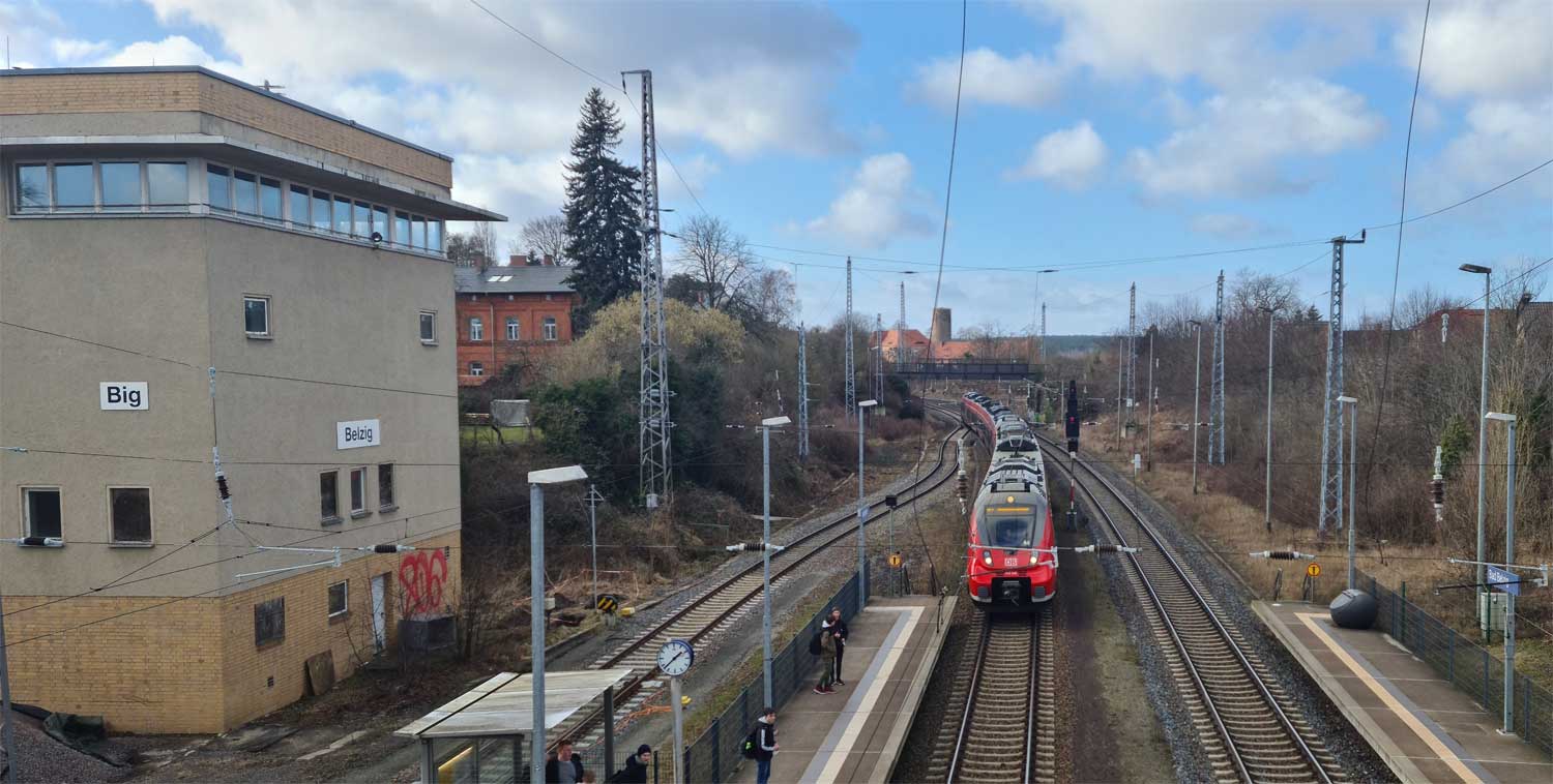 Belzig Reichsb | 65,23 | km 21,6 der Strecke Treuenbrietzen 0,0 - Belzig 21,6 - Brandenburg Neustadt 56,5 - Rathenow 90,25 - Neustadt (Dosse) 125,6 (Spitzkehre in Belzig) |