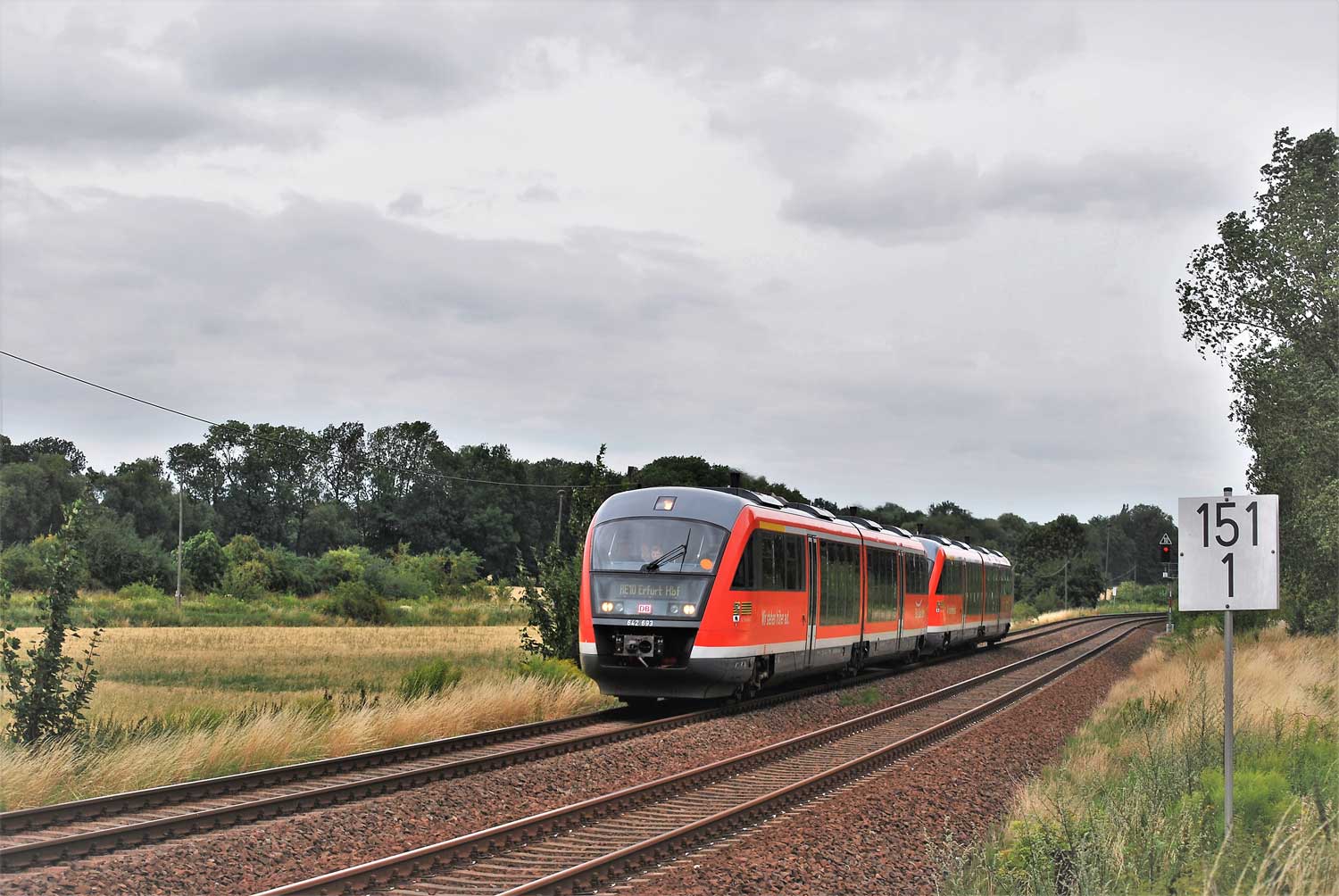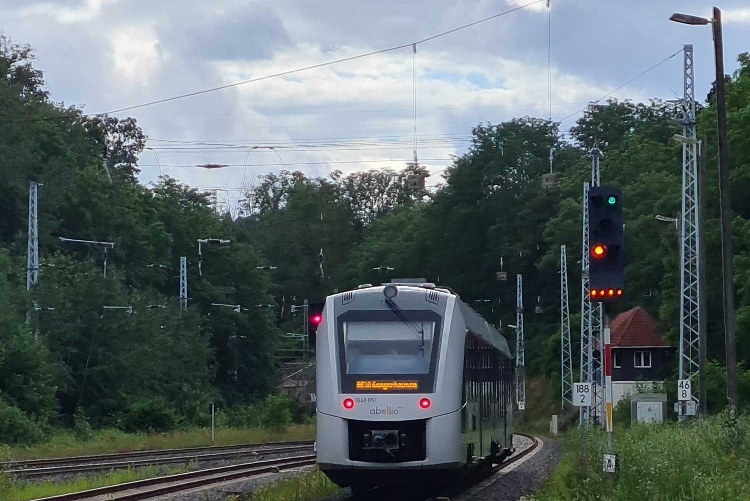 Der Zug fährt in Ri Berlin über die Gleise der Strecke Halle (Saale) Hbf 0,01 - Sangerhausen 59,22 - Nordhausen 97,07 - Eichenberg 170,48 - Hann. Münden 193,54