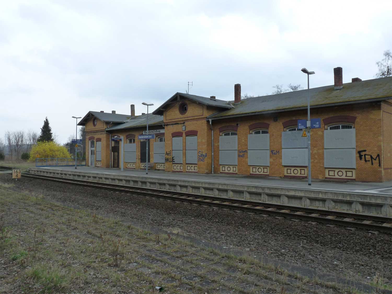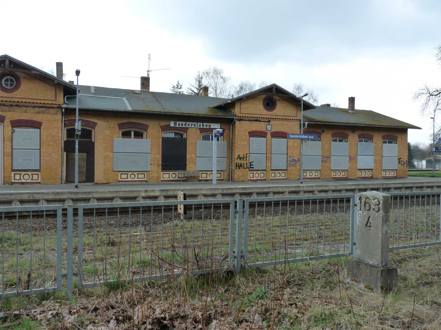 Sandersleben (Anh) | 163,41 | km 45,42 der Strecke Halle (Saale) Hbf -1,16 - Aschersleben 56,39 - Halberstadt 88,90 - Vienenburg Gbf 124,95 - Grauhof Gbf 135,87 - LangeIsheim 142,36 |