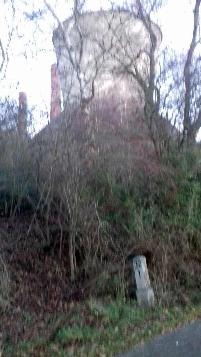 Im Hintergrund ein Kühlturm aus der Zeit des 2. Weltkrieges: Hier sollte Wasserstoffperoxid hergestellt werden.