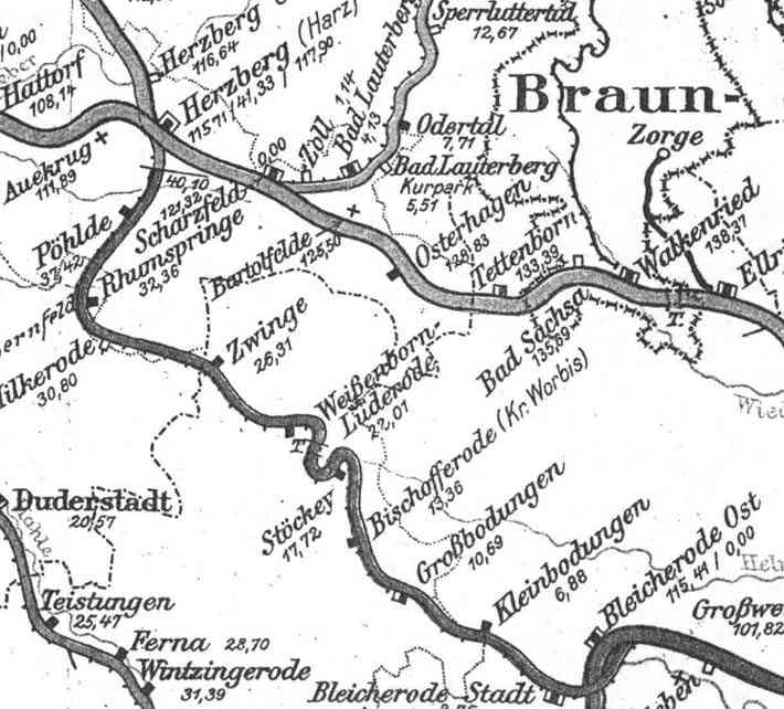 Herzberg (Harz)   41,33 km 115,71 der Strecke (Hannover Hbf 0,0) - Northeim (Han) 88,56 - Walkenried 138,37 - Grenze Englische Besatzungszone/Sowjetische Besatzungszone 142,045 - Ellrich 142,89 - Nordhausen 157,43