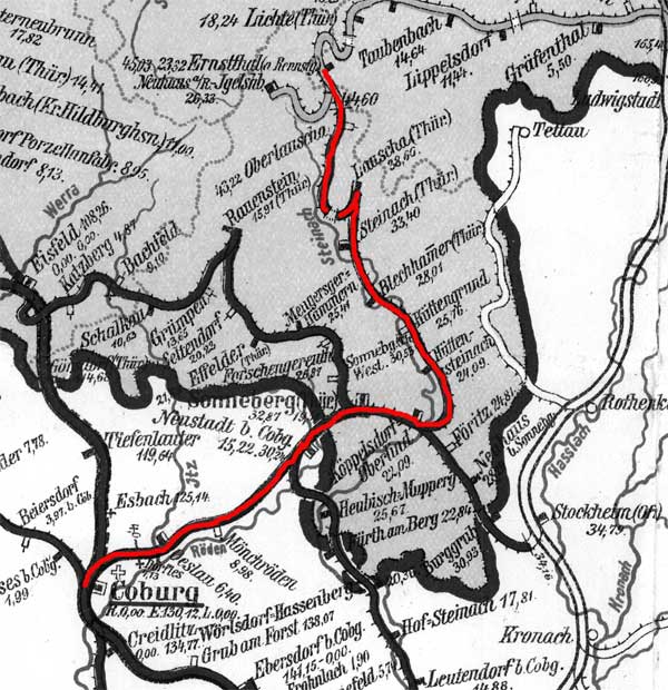 Coburg 0,0 - Neustadt (b Coburg) 15,22 - Streckenunterbrechung - Grenze BRD/DDR 17,02 - Streckenunterbrechung - Sonneberg (Thür) 19,51 - Lauscha (Thür) 38,66 - Ernstthal am Rennsteig 45,03