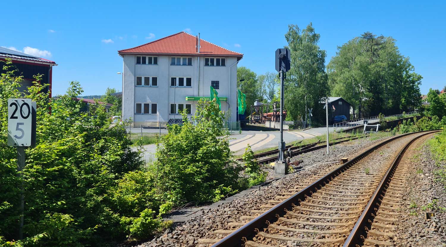 Blick vom Zug aus auf den Bf Lauscha (Thür)