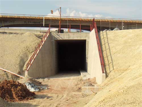 unterquert die Autobahn und die Straßenbrücke über die Autobahn.