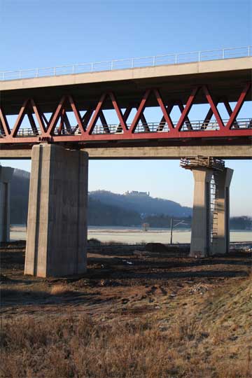 Itztalbrücke am 10.12.2005 Hinter der Eisenbahnbrücke die im Bau befindliche Autobahnbrücke der A73 Im Hintergrund die Veste Coburg (Foto: Dirk Ammon, Dezember 2005) |