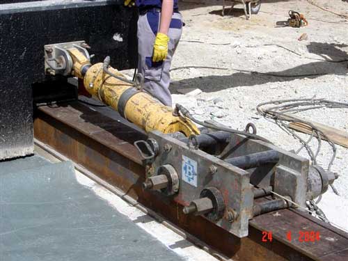 Steuerungsaggregat der Hydraulik, im Hintergrund einer der Hydraulikzylinder