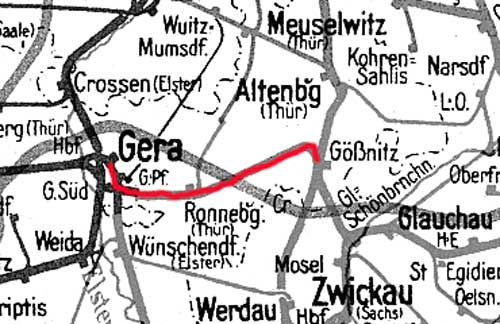 infolge des Wismut-Bergbaues. Die Strecke wurde um ca. 480 m verlängert und umkilometriert. Die Umkilometrierung wurde nur bis Gera-Süd durchgeführt, da bereits nach dem 2. Weltkrieg zwei Gleise auf dem bis dahin viergleisigen Abschnitt zwischen Gera-Süd und Gera Hbf als Reparationsleistungen abgebaut worden sind und auch nicht wieder augebaut wurden. |