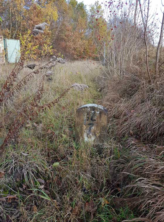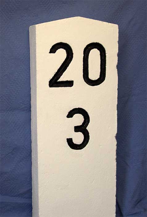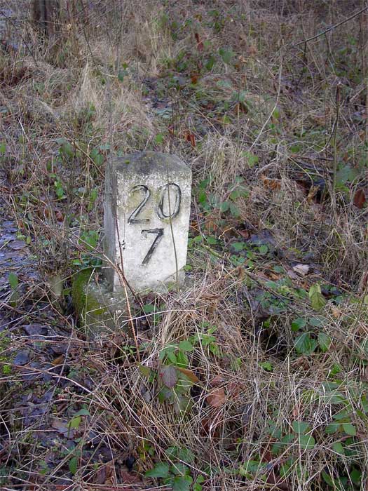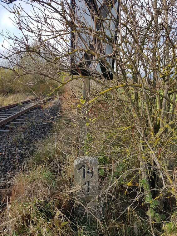 Der Kilometerstein ist beschriftet. Es wurde ein anderer Stein genommen, der verkehrtherum eingegraben wurde. Man sieht noch die 3 von km x,3.