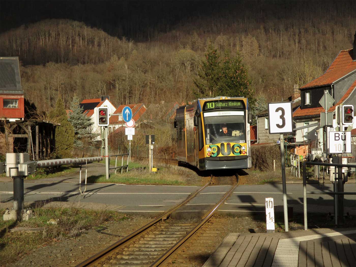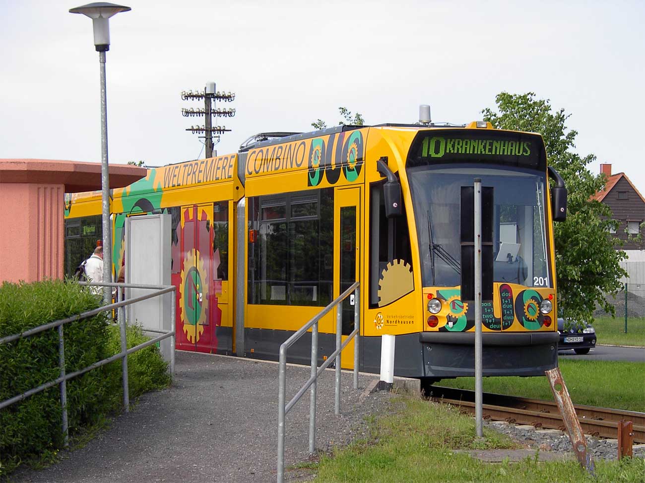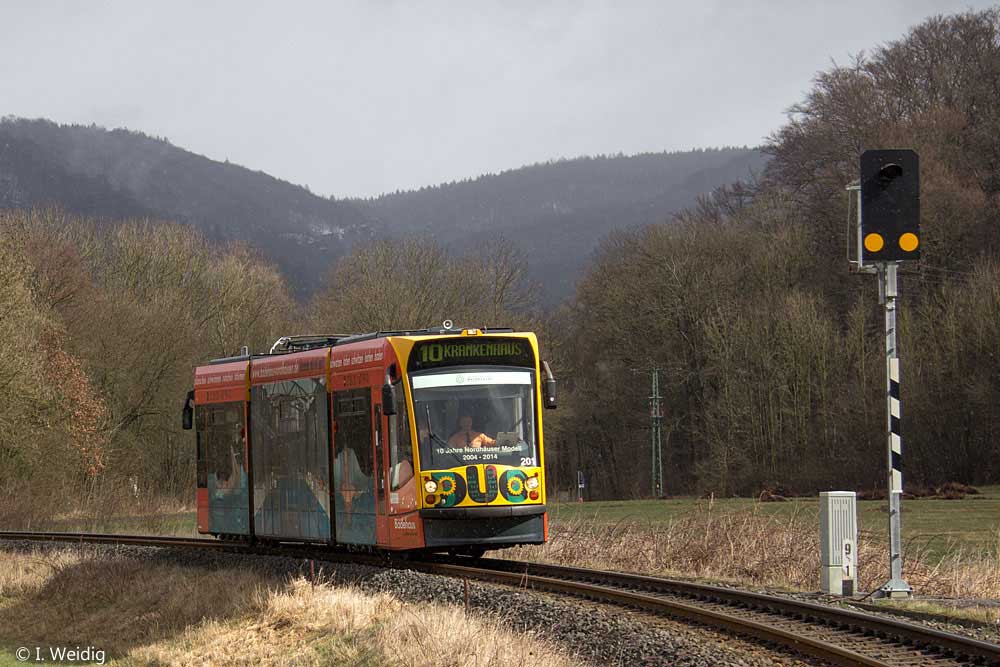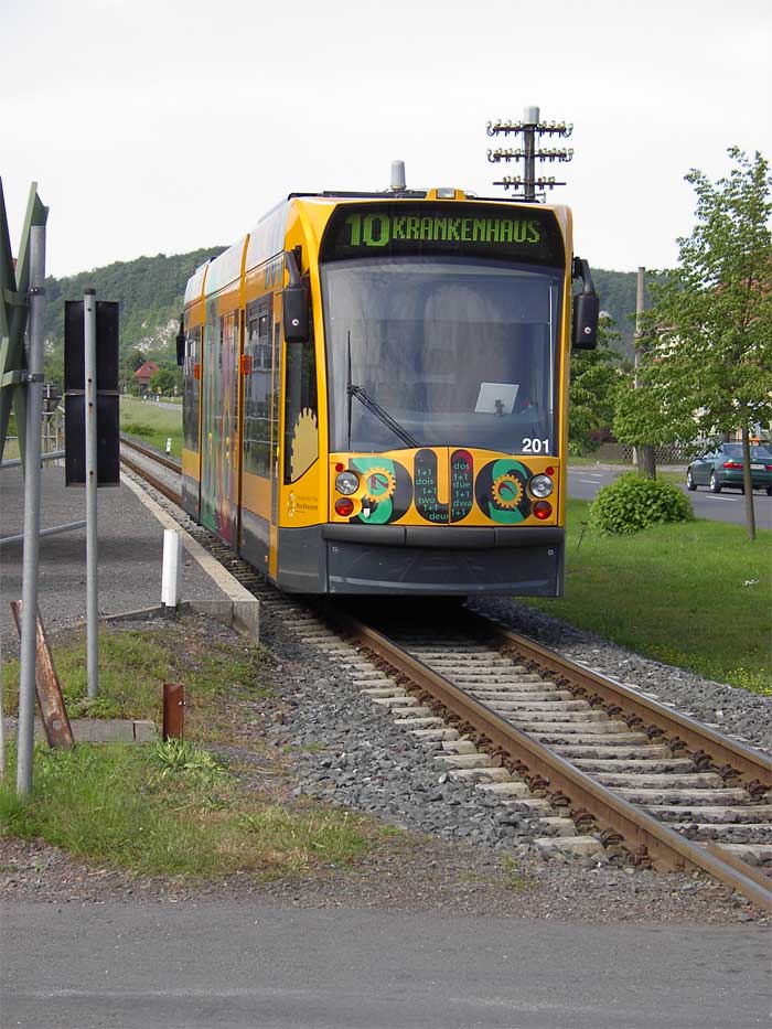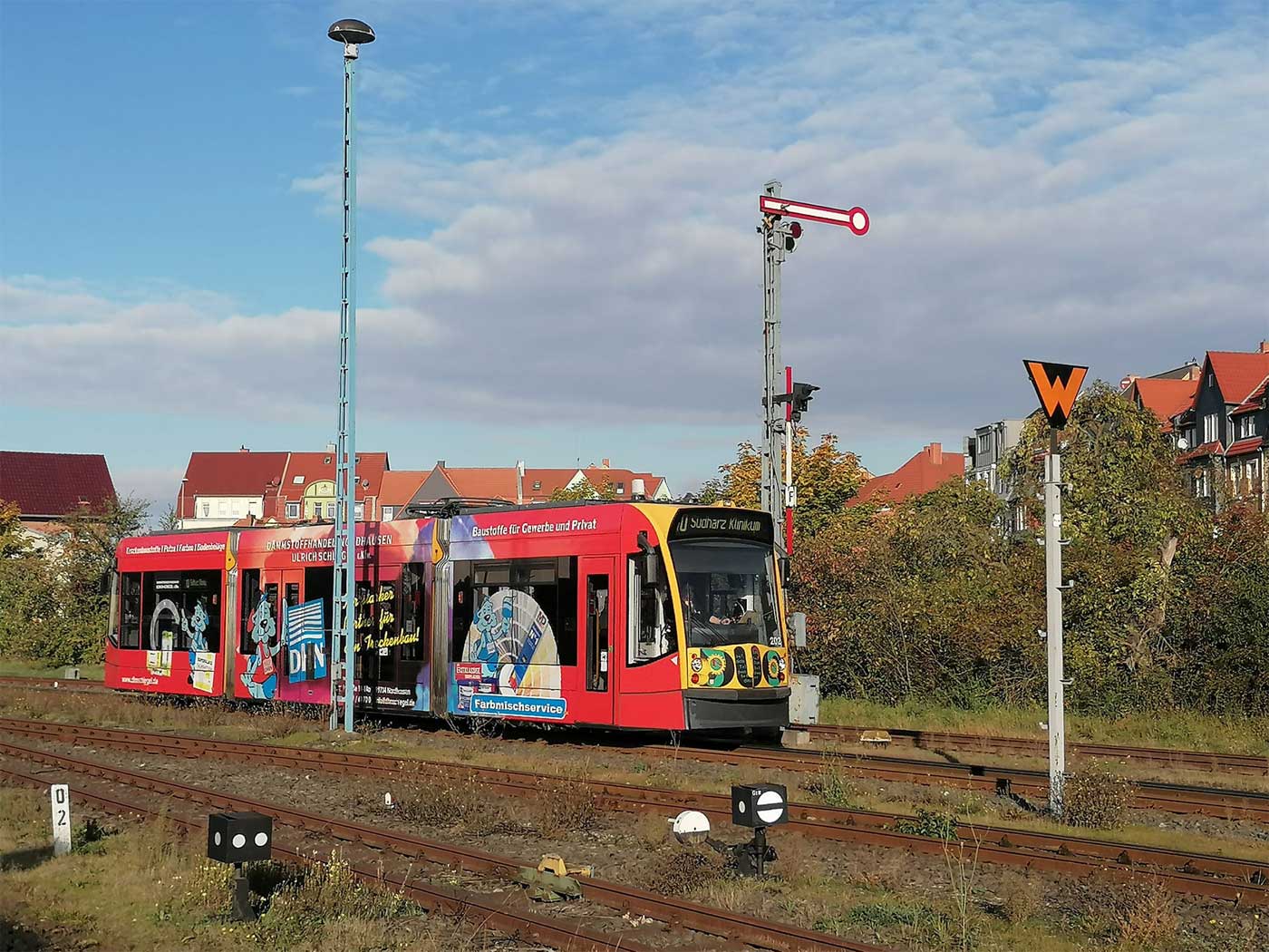 km 0,4 in Nordhausen Nord - einfahrende Straßenbahn