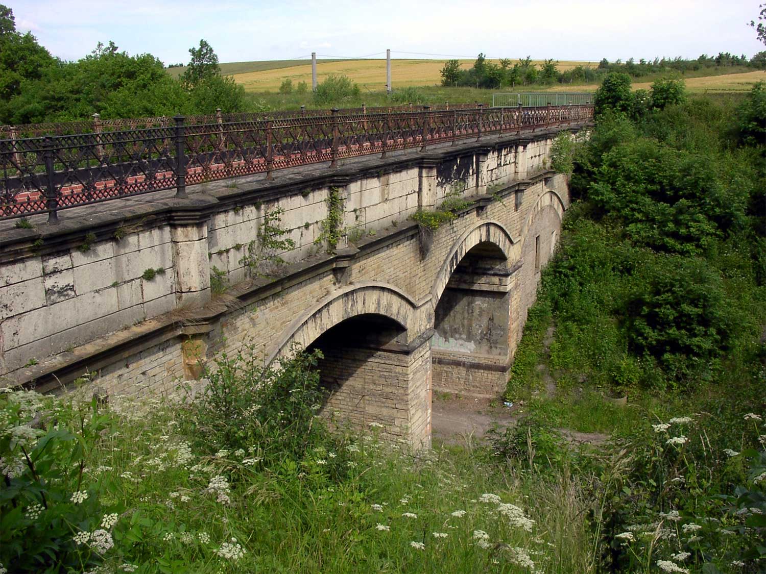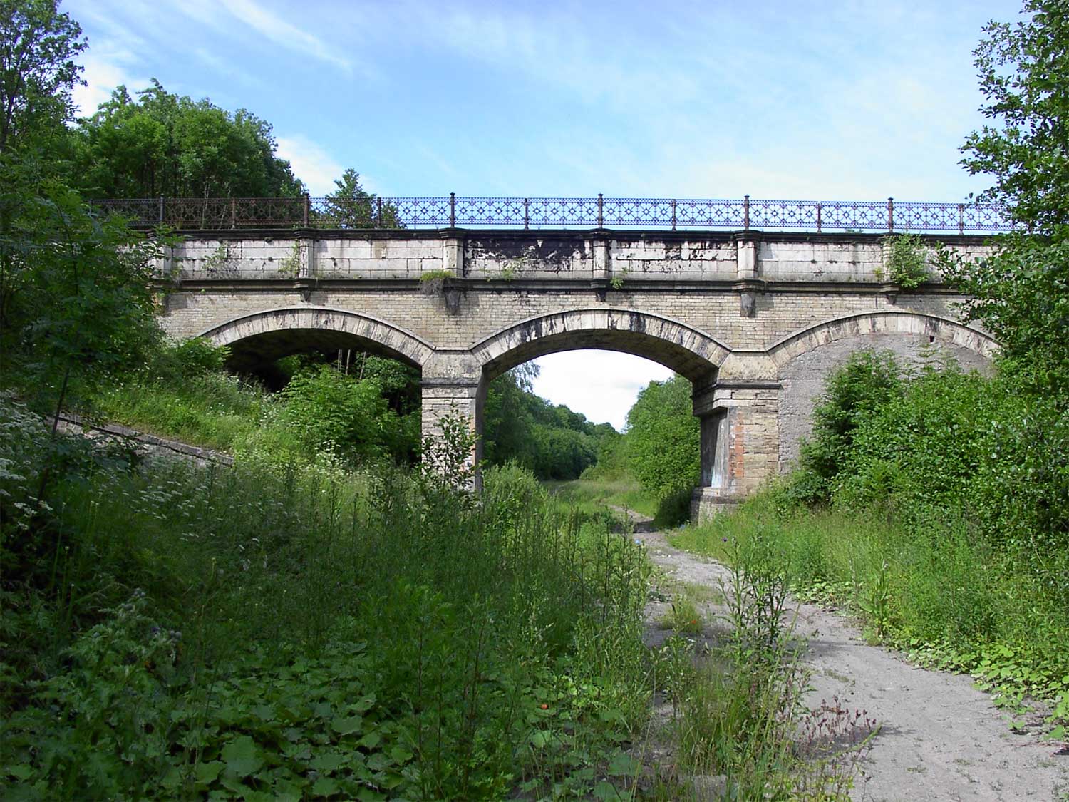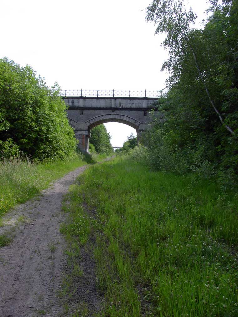 links die alte Trasse mit dem Aquädukt im Hintergrund.