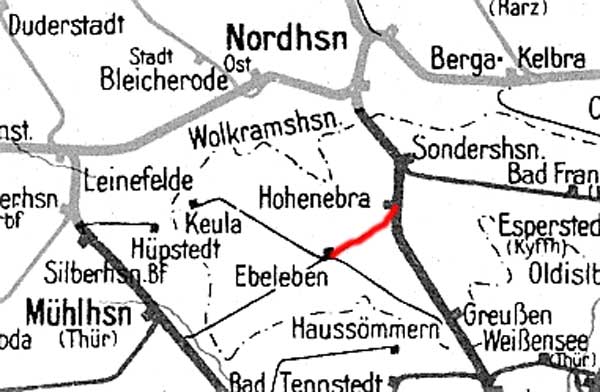 Hohenebra 0,0 - Abzw Ebeleben Süd 7,681 = km 17,854 - Ebeleben (neuer Bf) 19,15 - Menteroda (Thür) 30,50