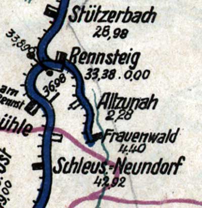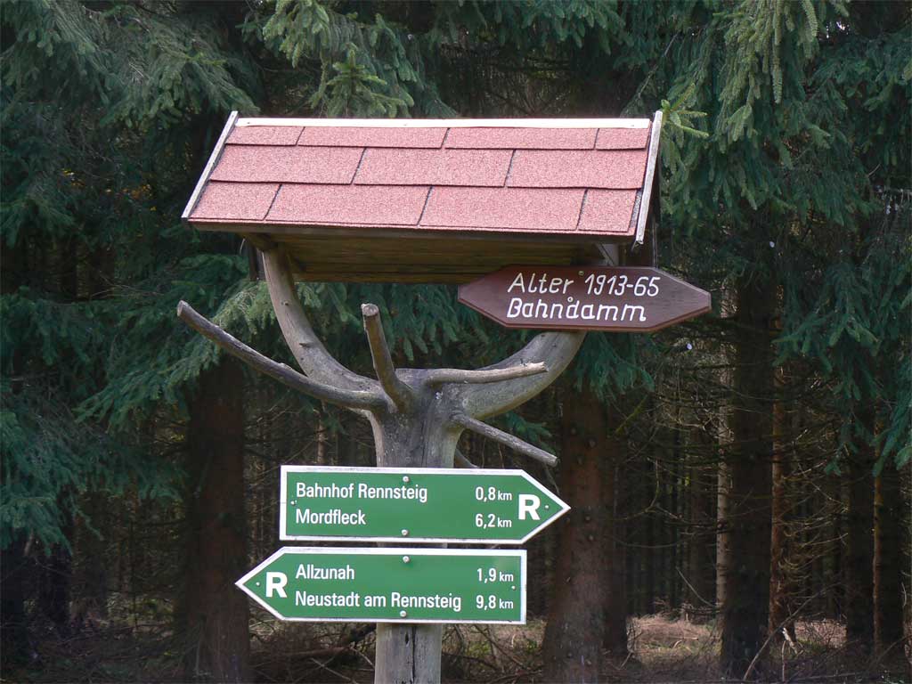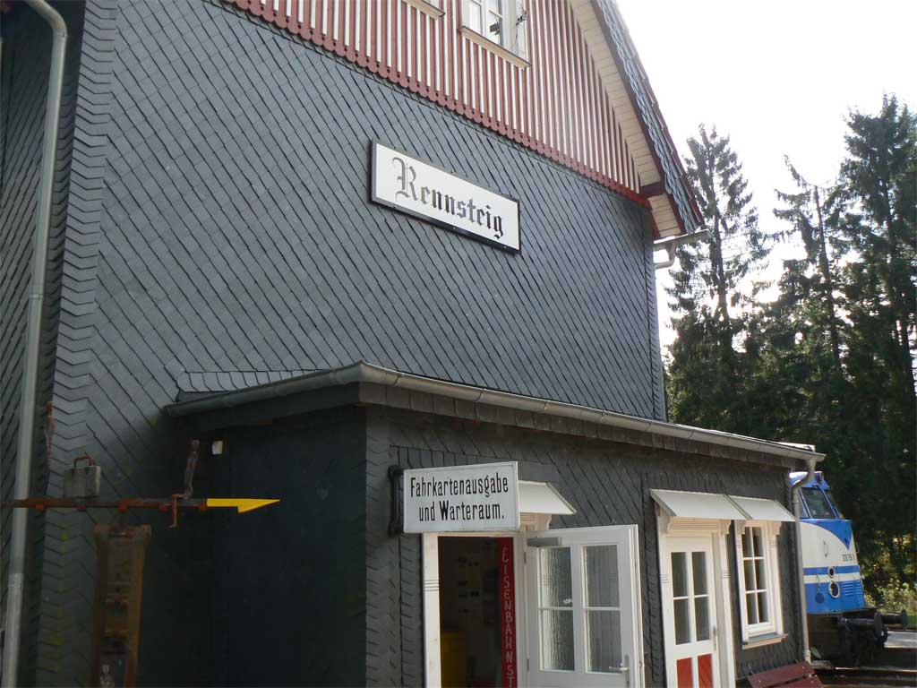 Rennsteig | 0,0 | km 33,38 der Strecke Plaue (Thür) 0,0 - Ilmenau 19,18 - Rennsteig 33,38 - Schleusingen 50,98 - Themar 61,97 |