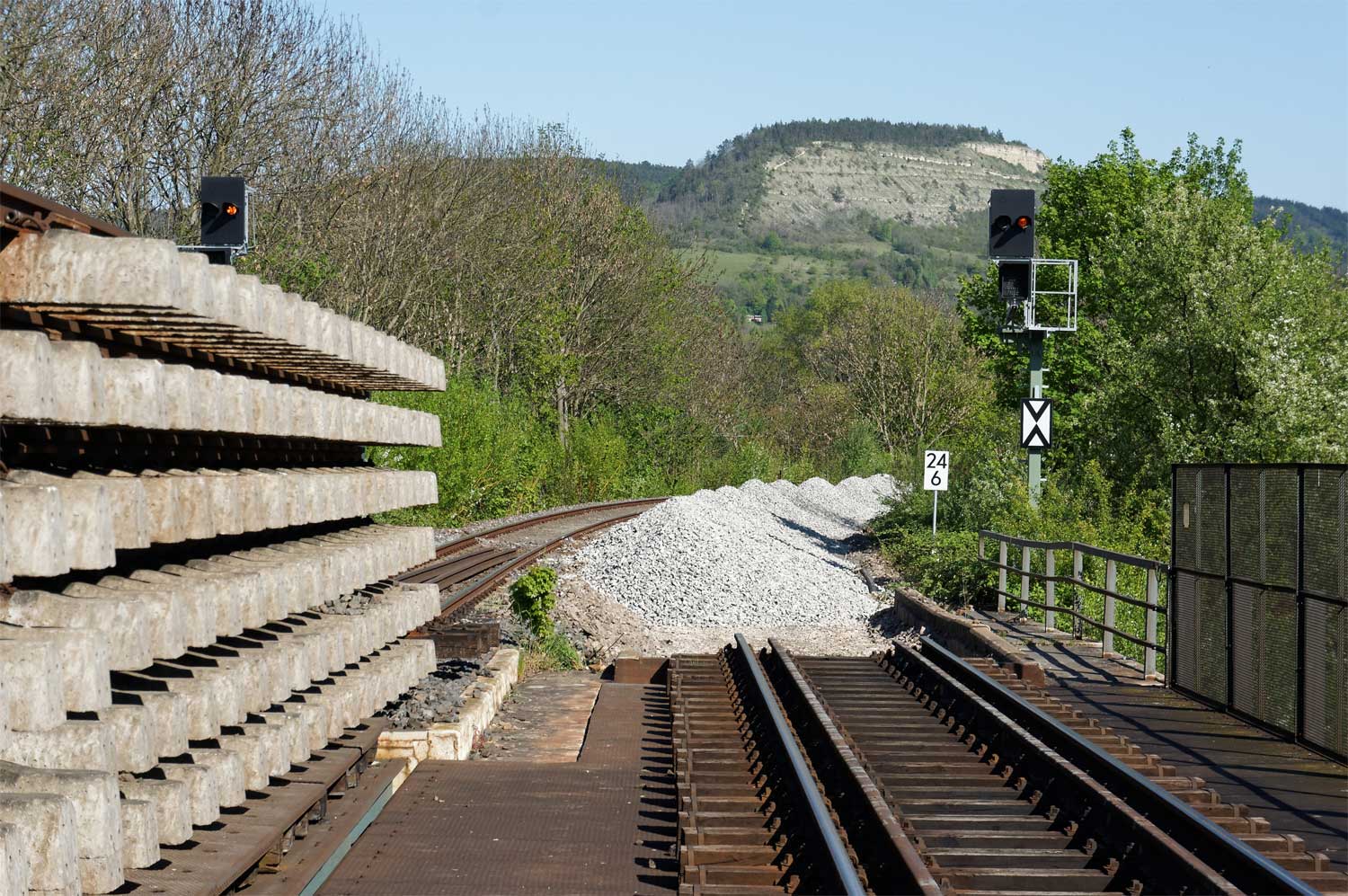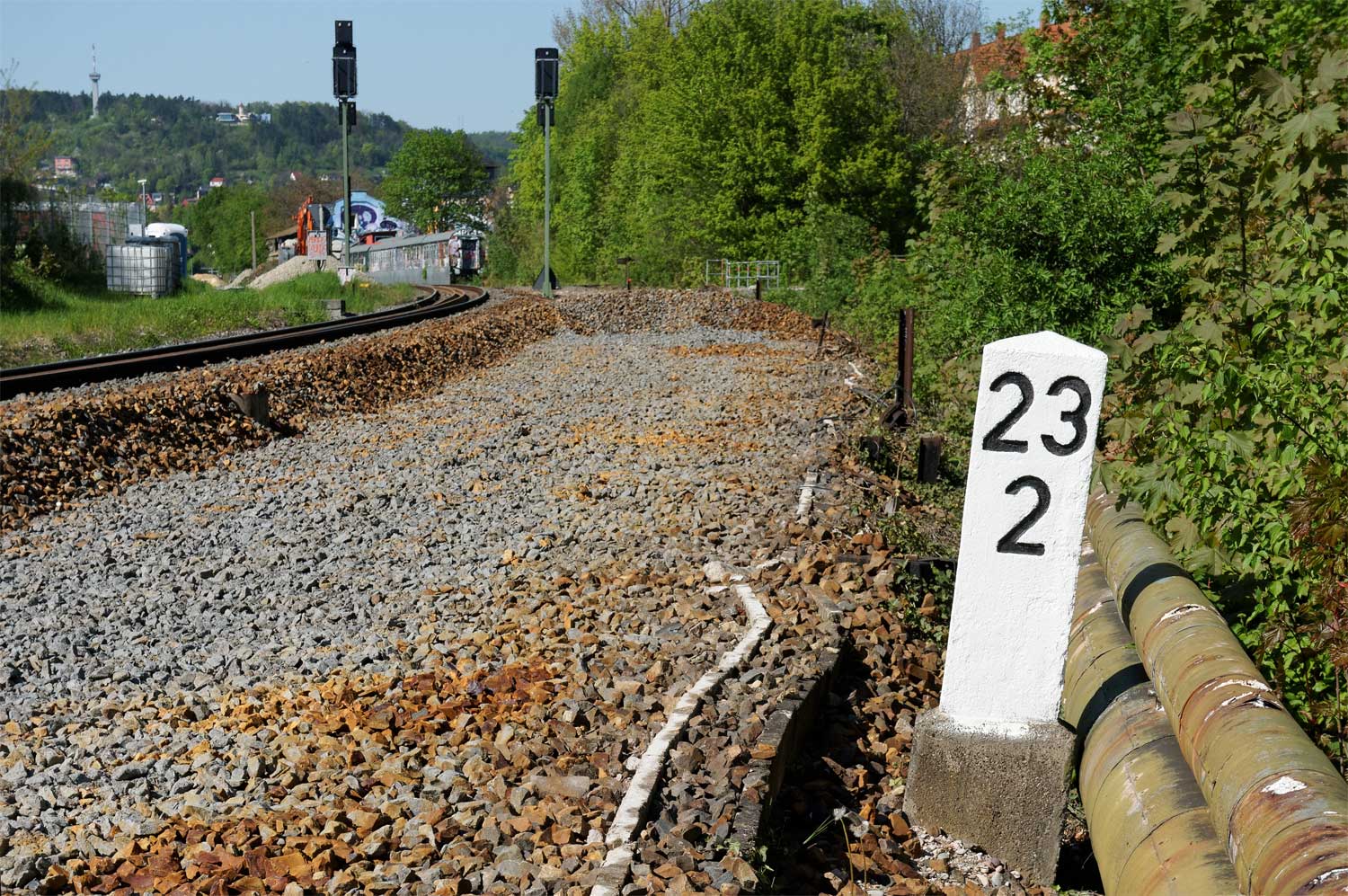 km 0,4 (Stein, Richtungsgleis) in Weimar - Blick Richtung Streckenanfang