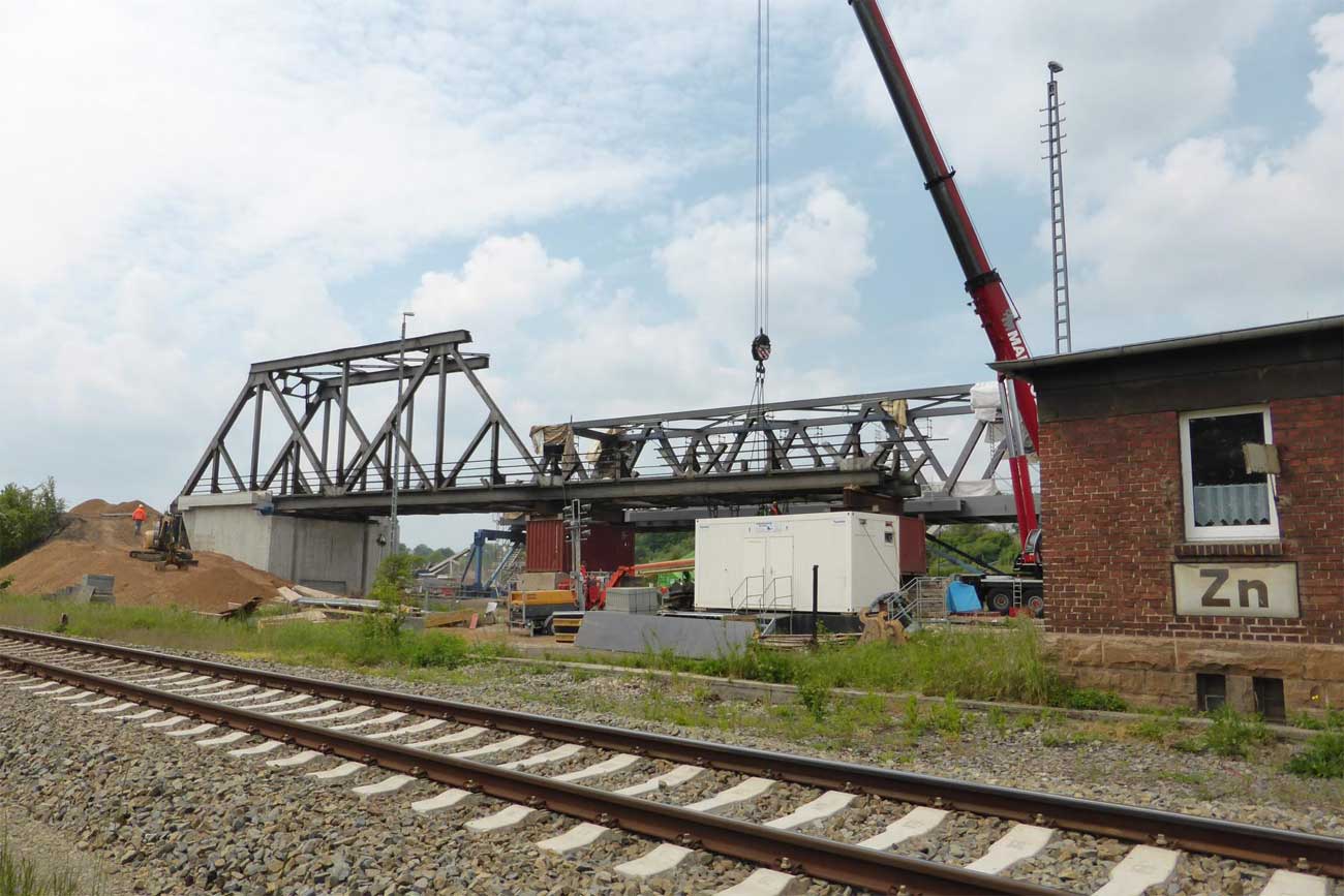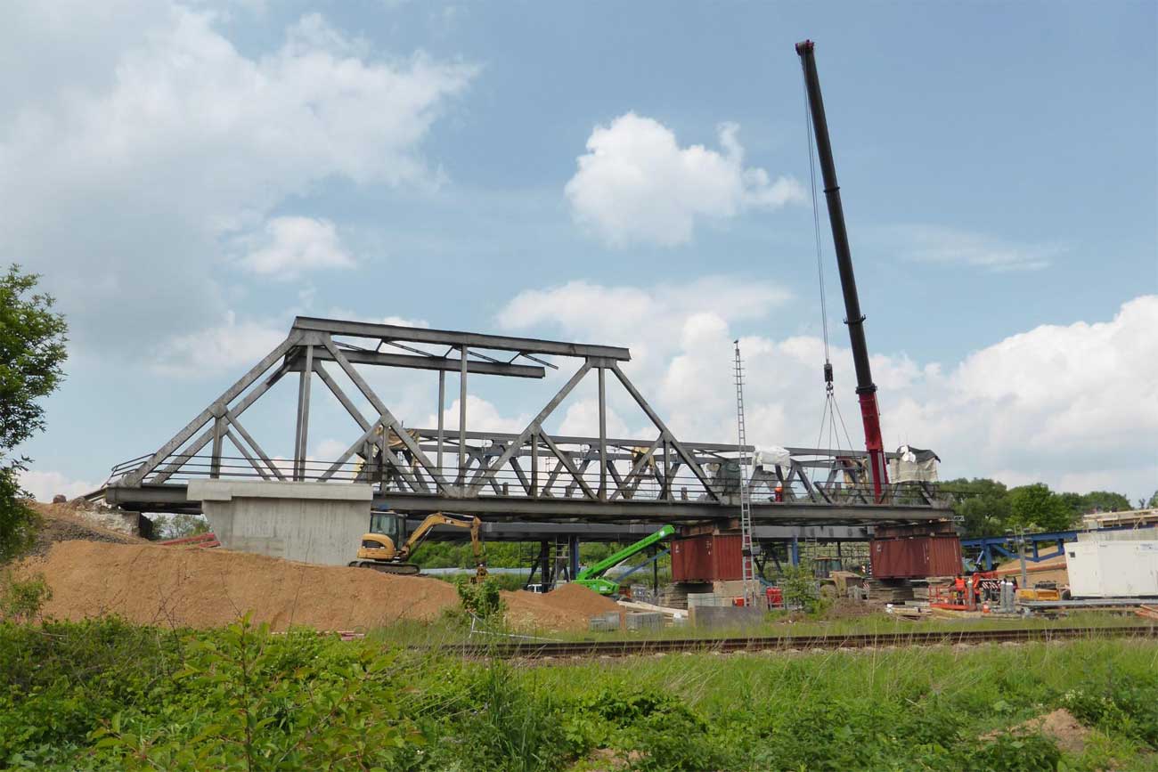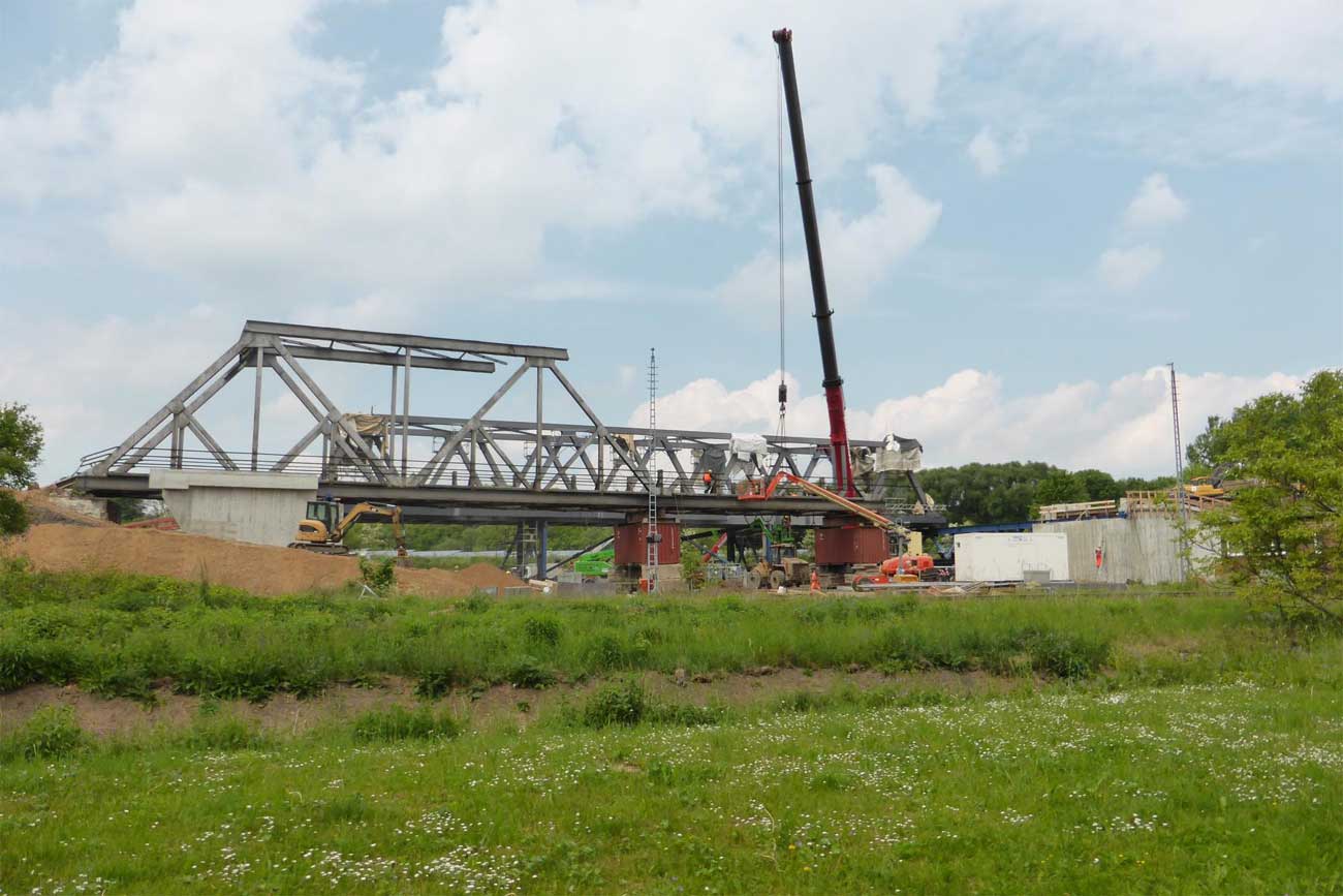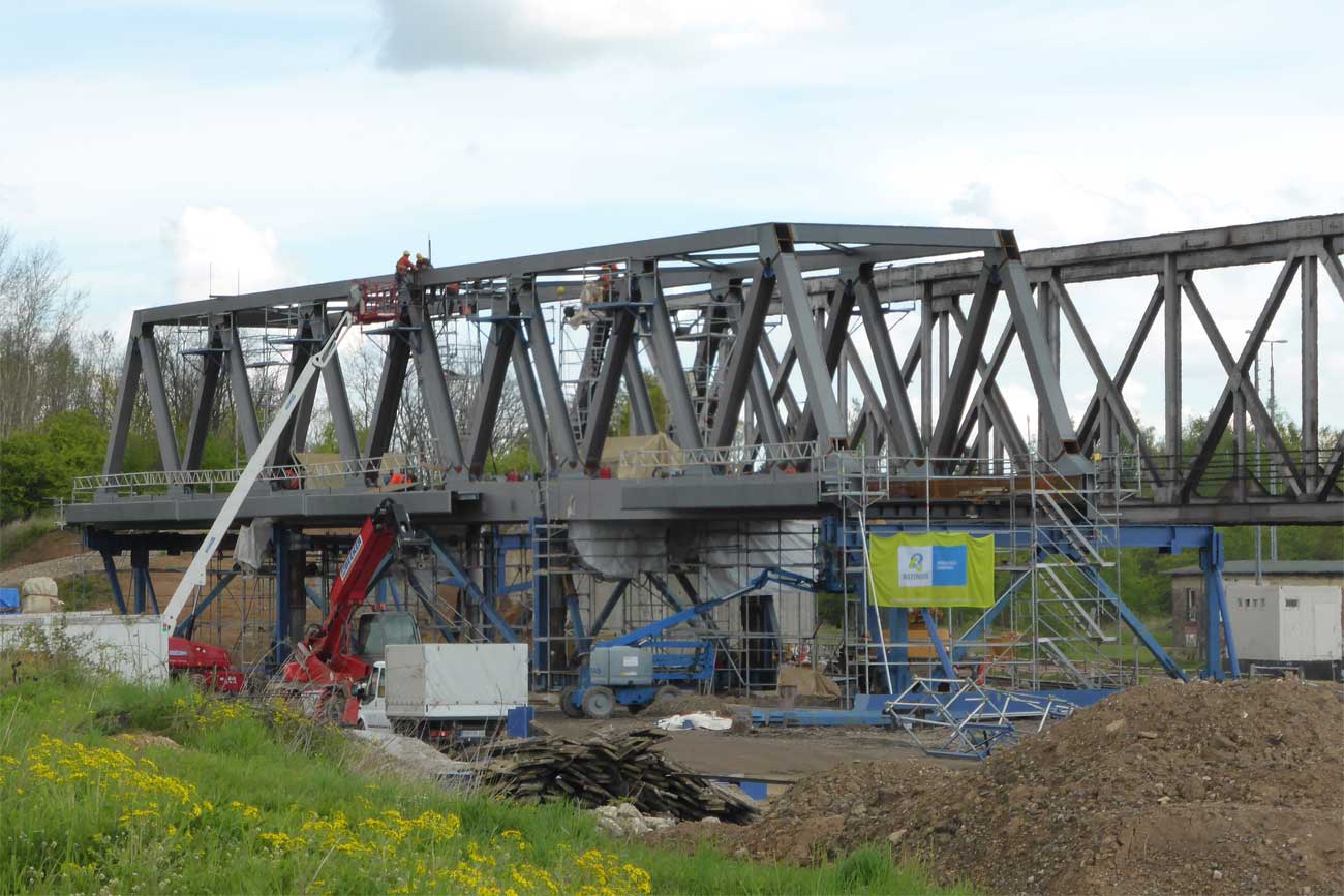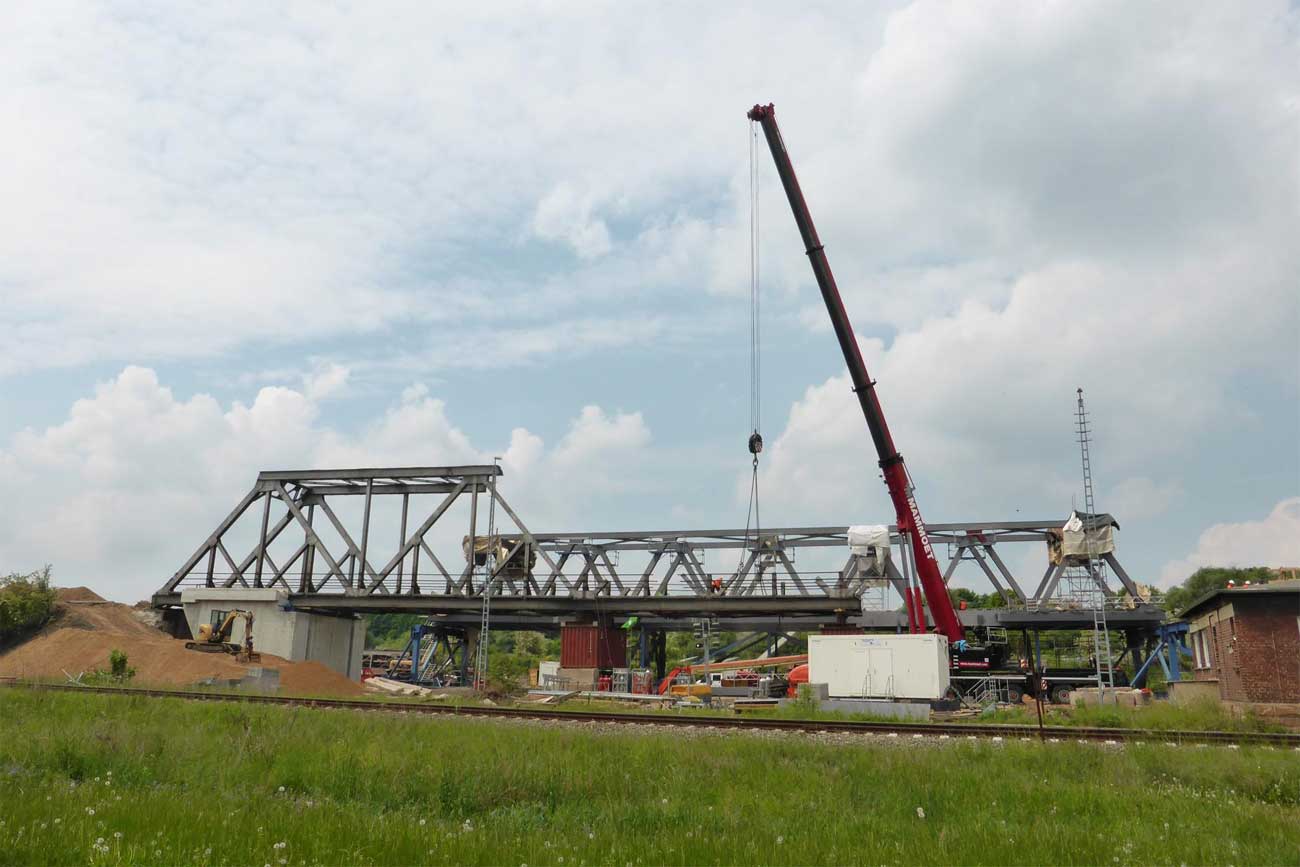 2 Überbauten von je 80 m, 2 von je 56 m und 1 Brücke von 17,1 m Stützweite; Gesamtgewicht des Auftrages 1065 t