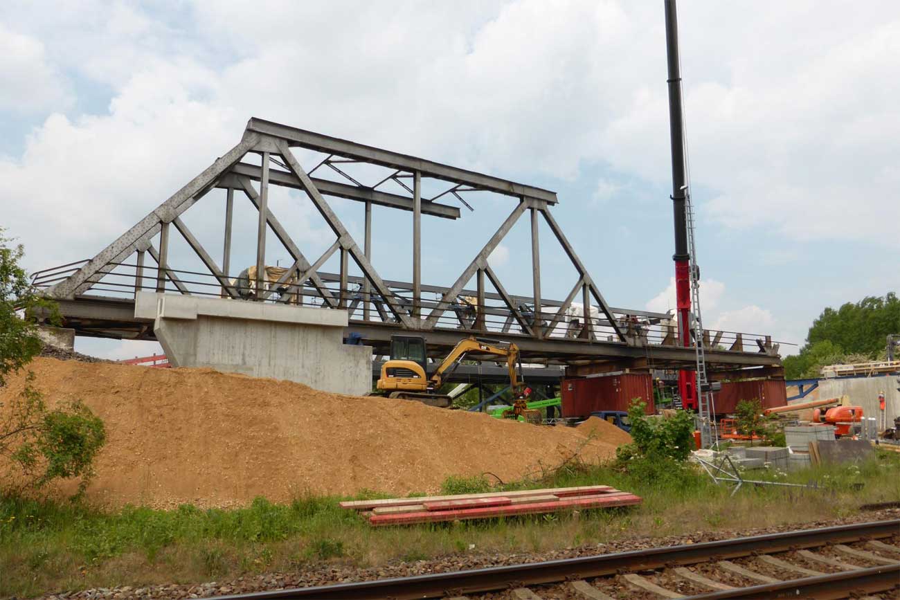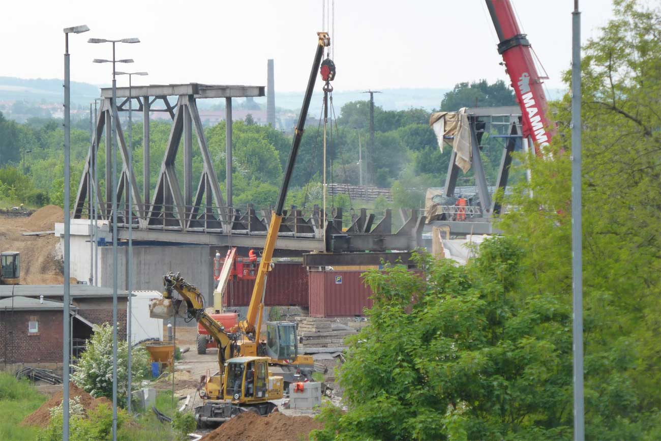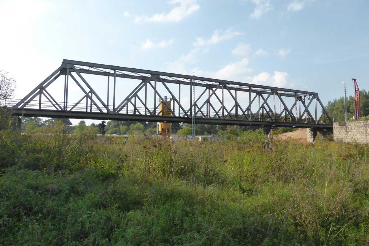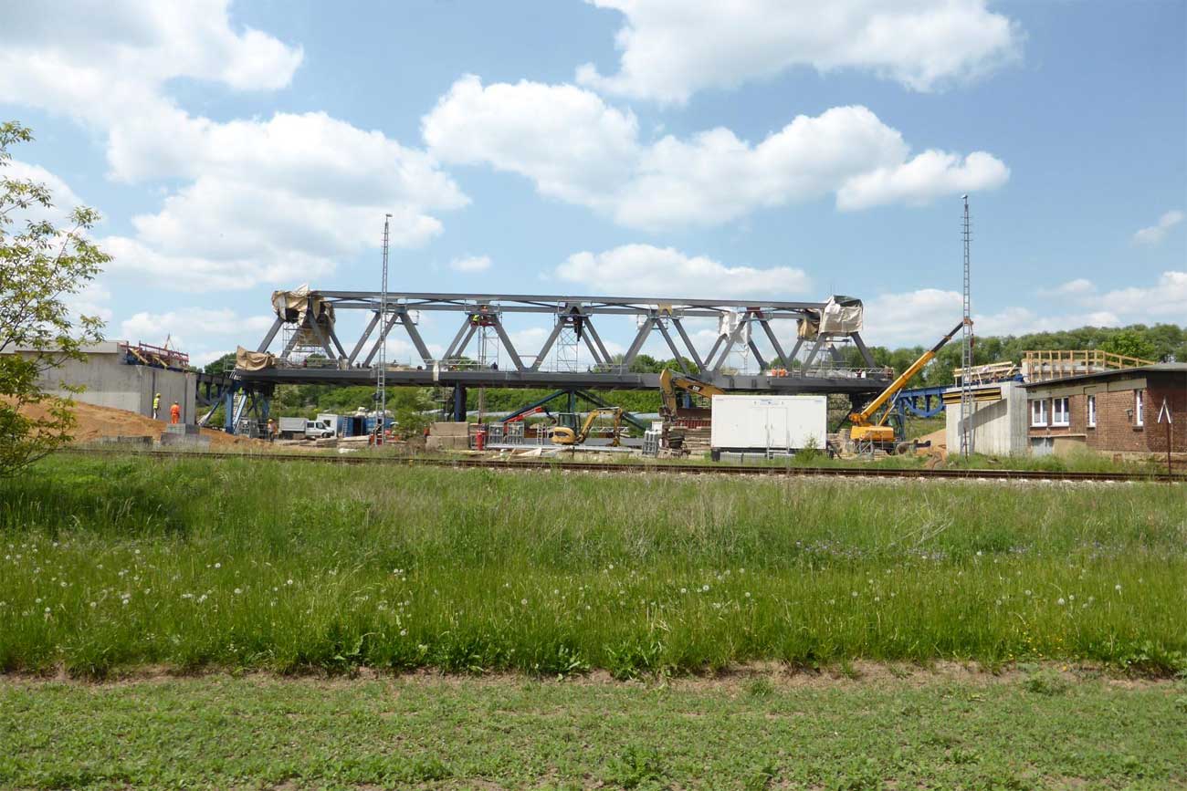 2 Überbauten von je 80 m, 2 von je 56 m und 1 Brücke von 17,1 m Stützweite; Gesamtgewicht des Auftrages 1065 t